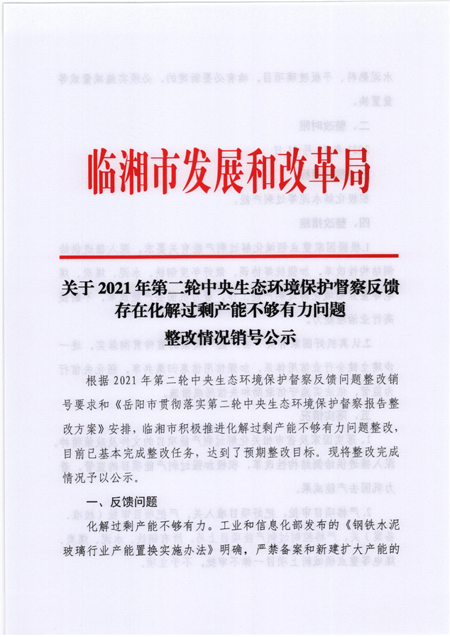 关于2021年第二轮中央生态环境保护督查反馈存在化过剩产能不够有力问题整改情况销号公示