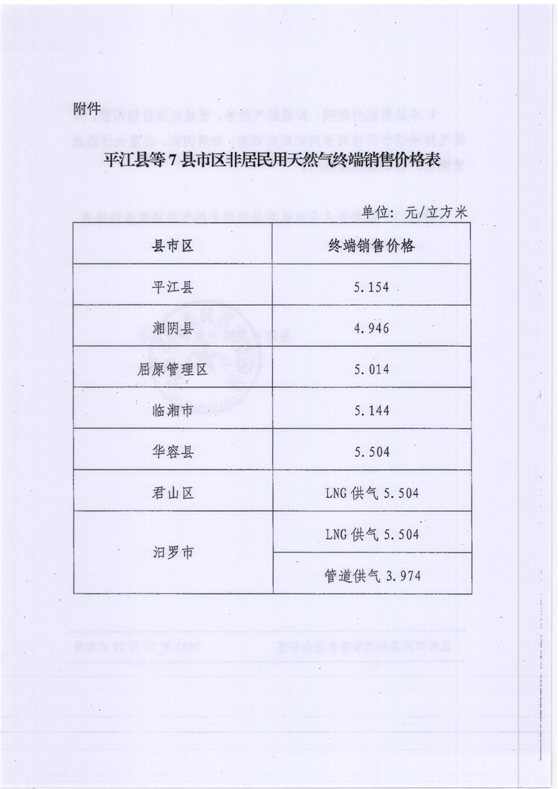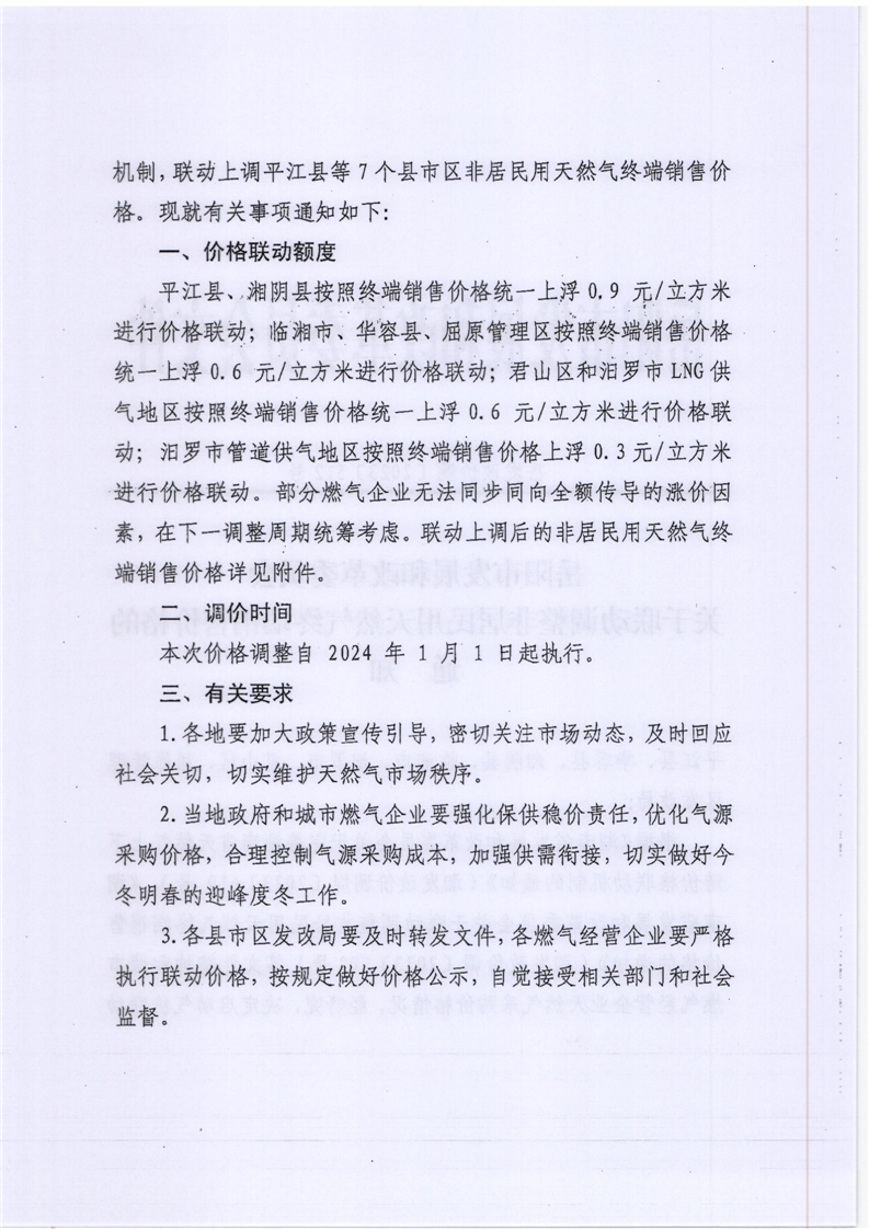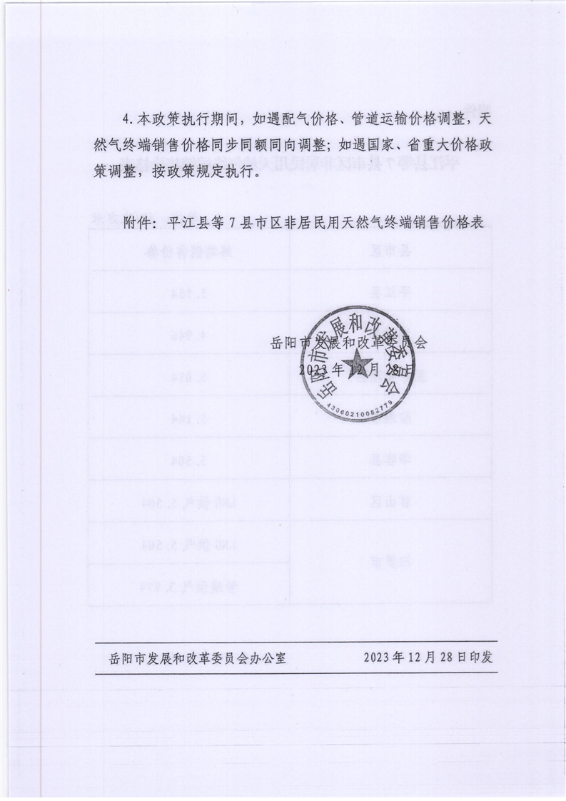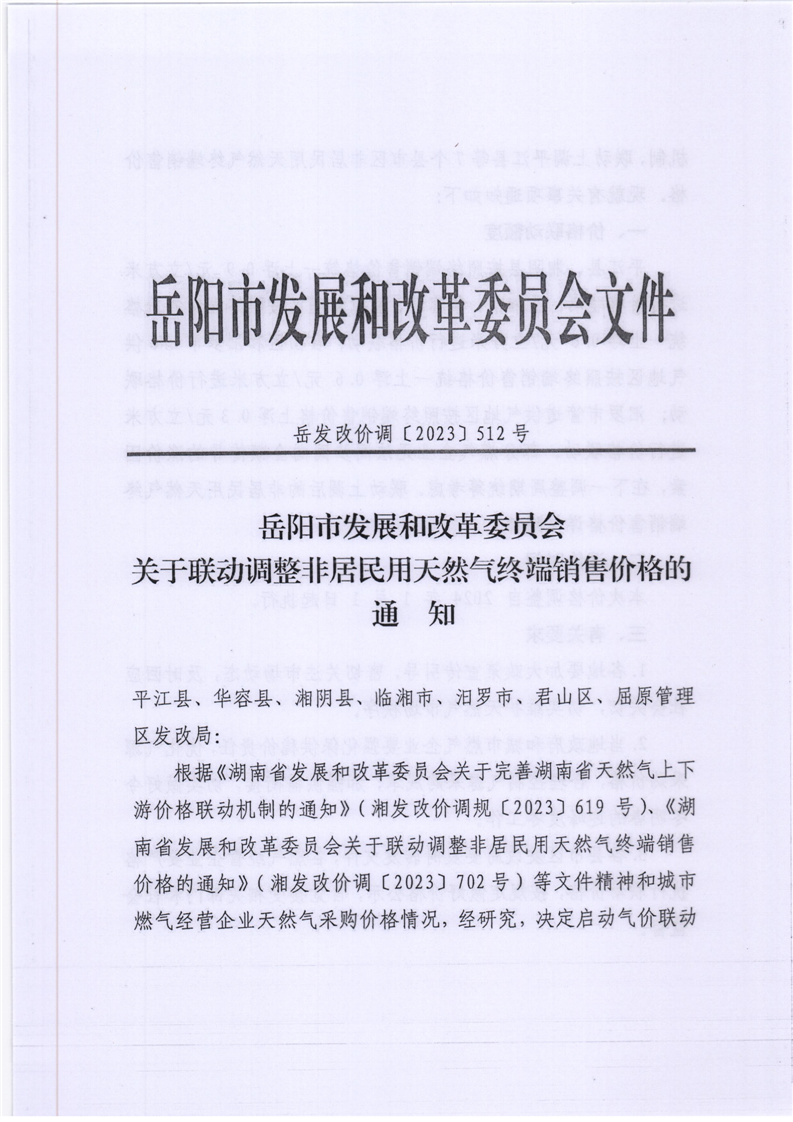 关于转发岳阳市发展和改革委员会《关于联动调整非居民用天然气终端销售价格