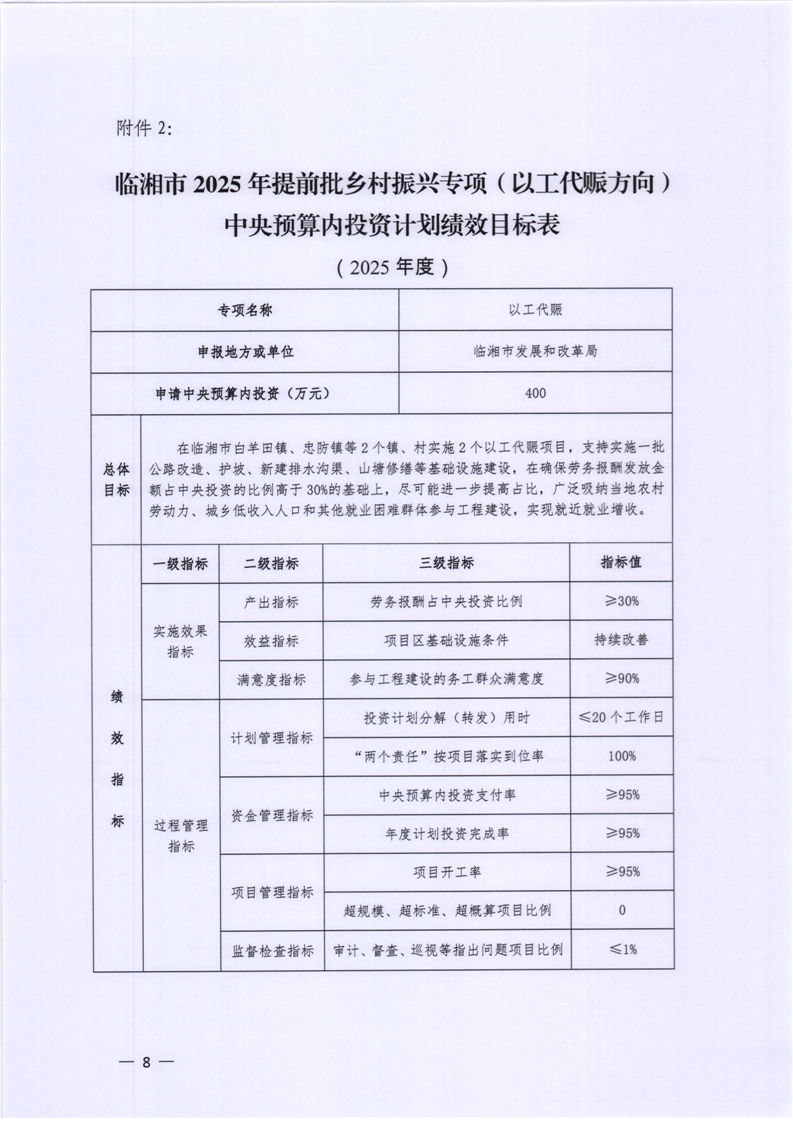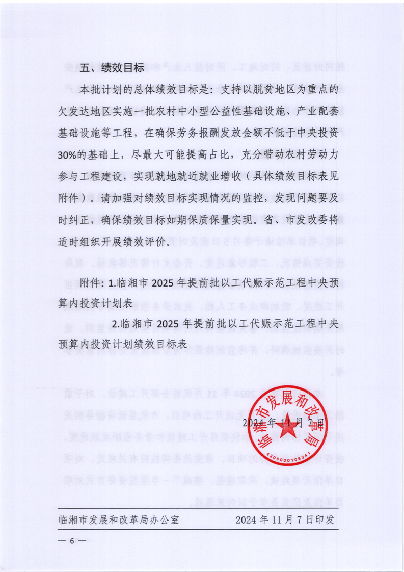 关于转发下达临湘市2025年提前批以工代赈示范工程中央预算内投资计划的通知