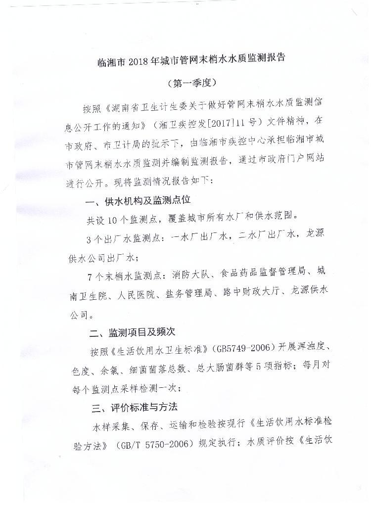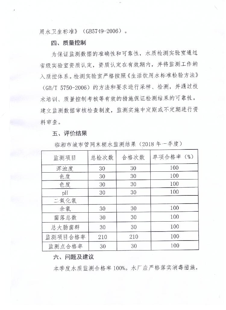 临湘市2018年城市管网末梢水水质监测报告(第一季度)