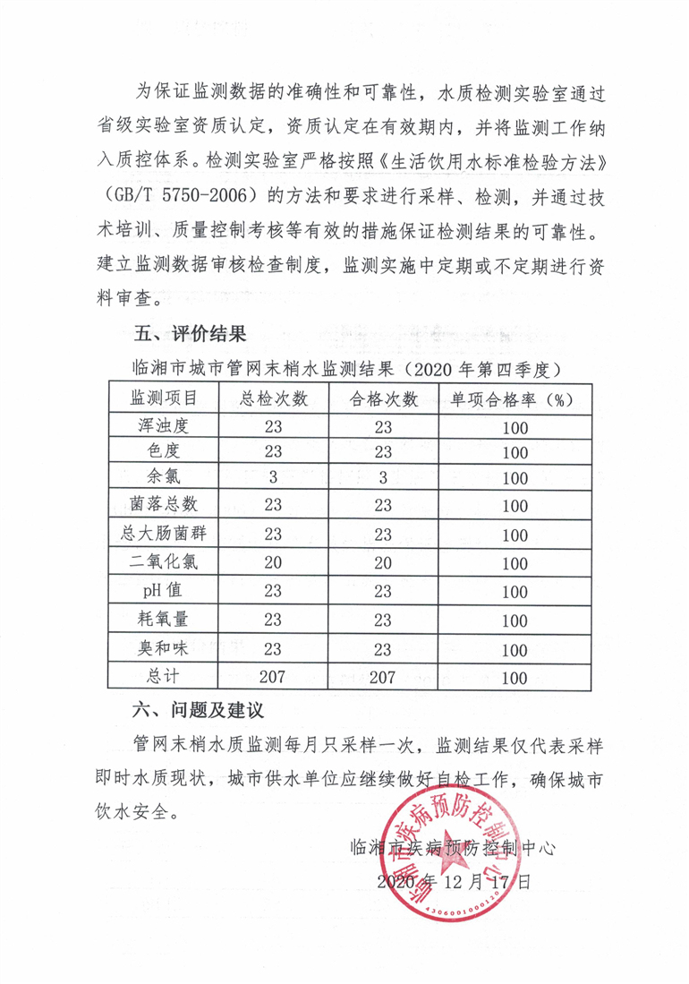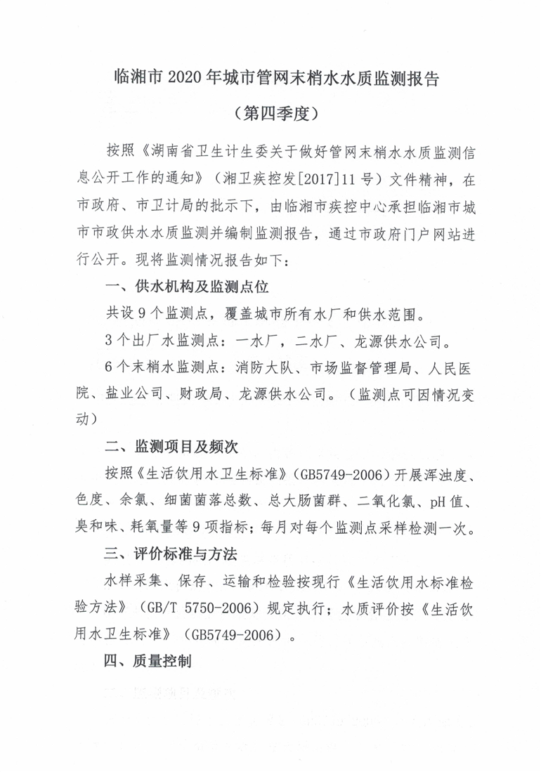 临湘市2020年度城市管网末梢四度季水质监测报告