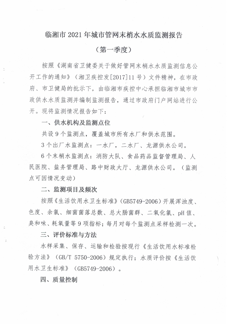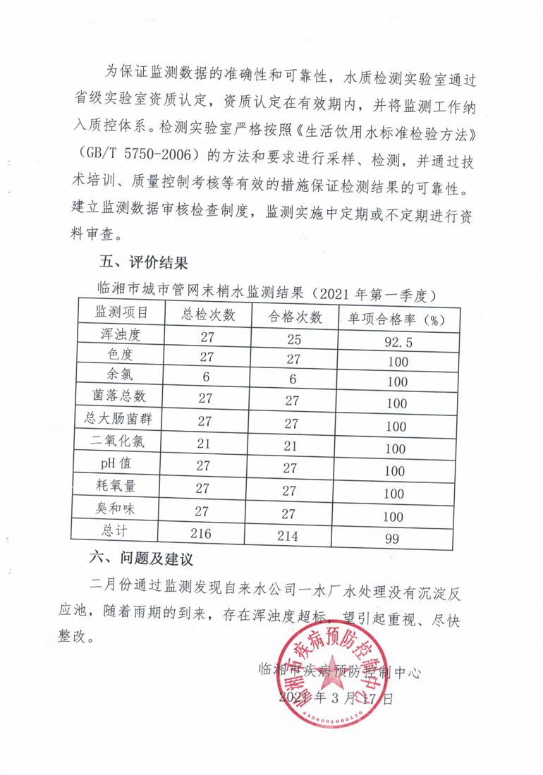 临湘市2021年城市管网末梢水质监测报告(第一季度)