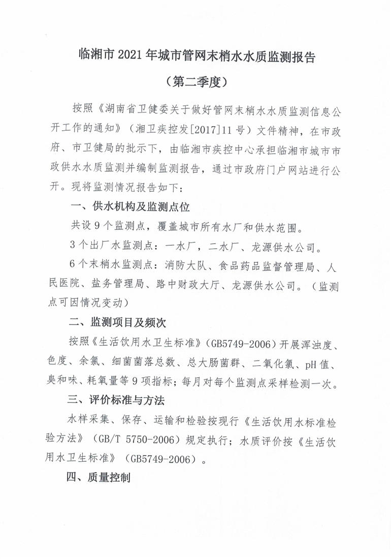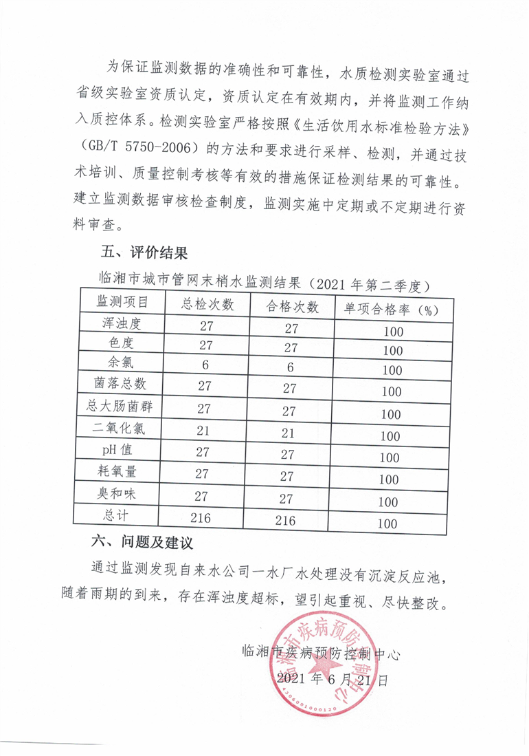 临湘市2021年城市管网末梢水质监测报告(第二季度)