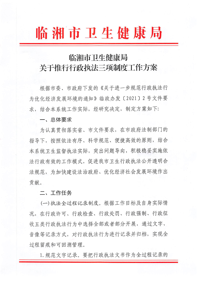 临湘市卫生健康局关于推行行政执法三项制度工作方案