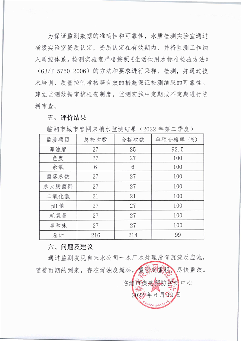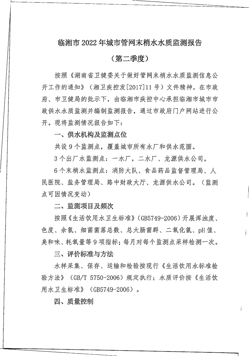 2022年城市管网末梢水水质监测报告(第二季度)