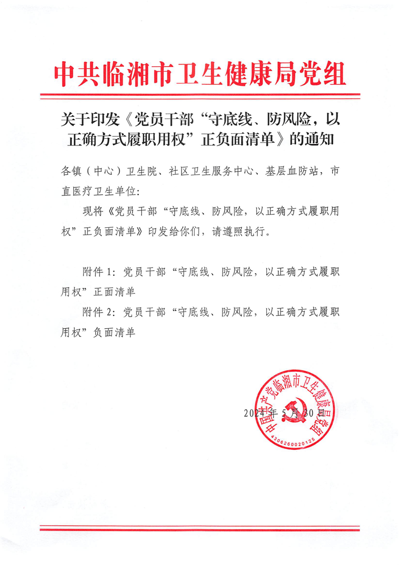 临湘市卫健系统党员干部“守底线、防风险,以正确方式履职用权正负面清单公示”