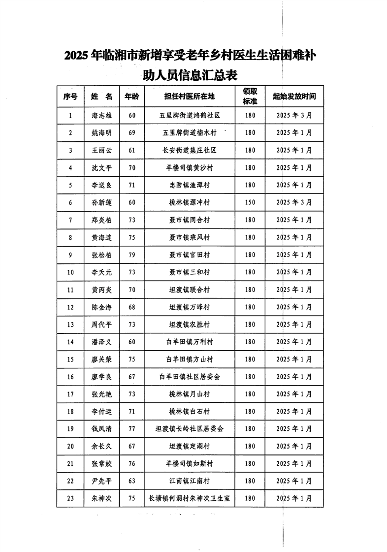 2025年临湘市新增享受老年乡村医生生活困难补助人员名单公示