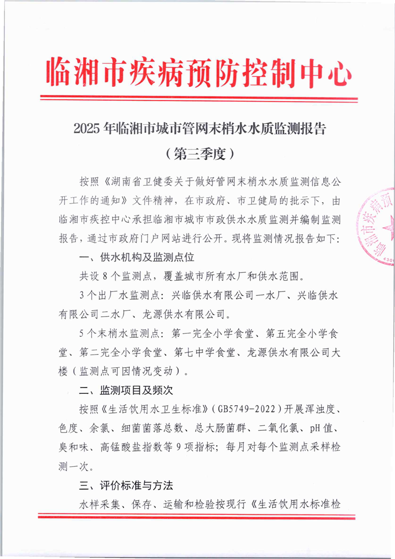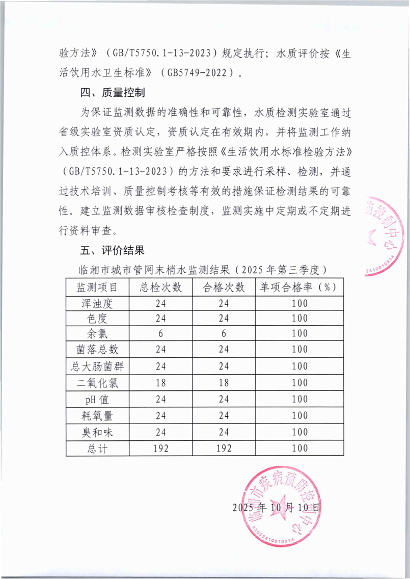 (三季度)2025年临湘市城市管网末梢水水质监测报告
