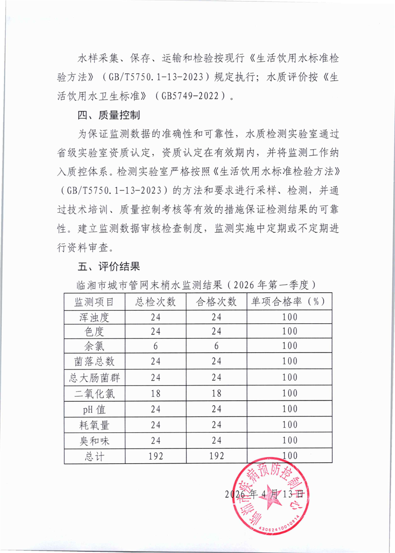 2026年一季度临湘市城市管网末梢水水质监测报告