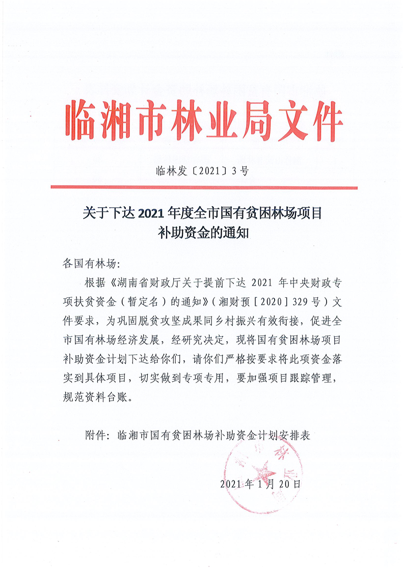 关于下达2021年度全市国有贫困林场项目补助资金的通知