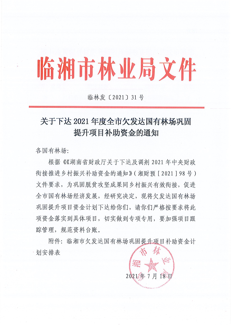 关于下达2021年度全市欠发达国有林场巩固提升项目补助资金的通知