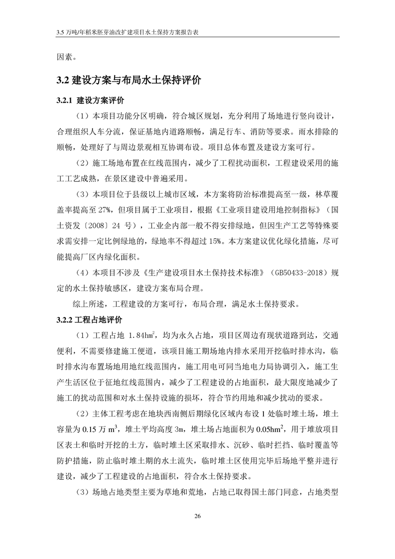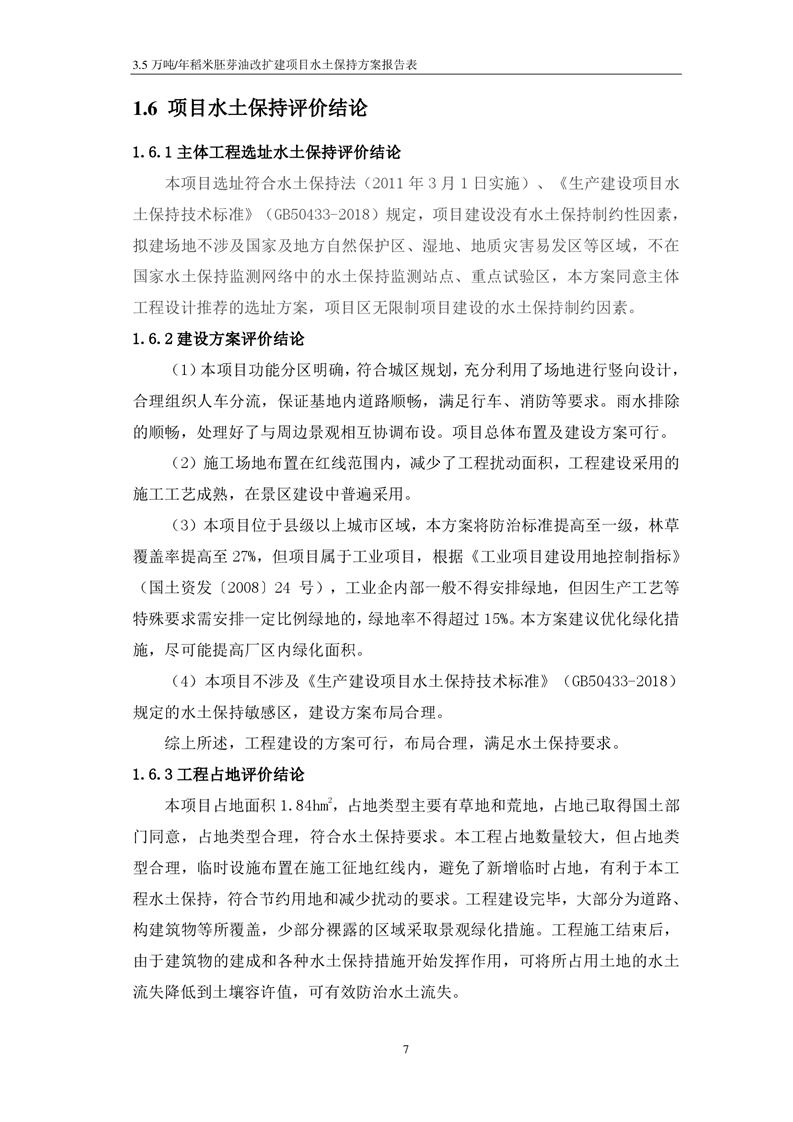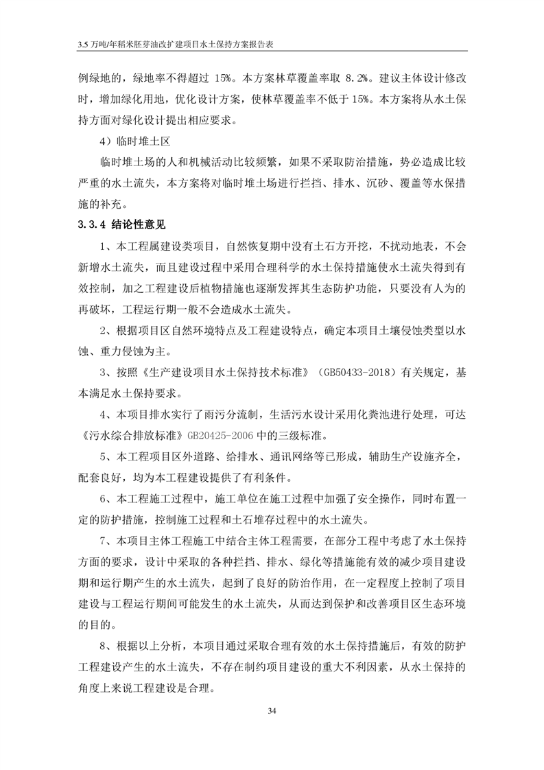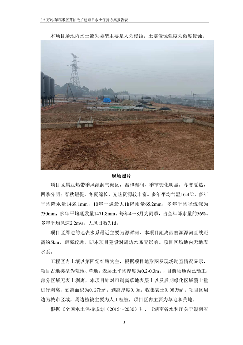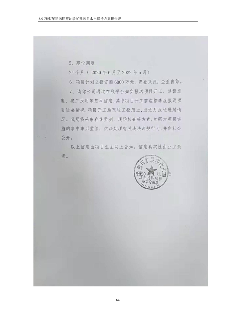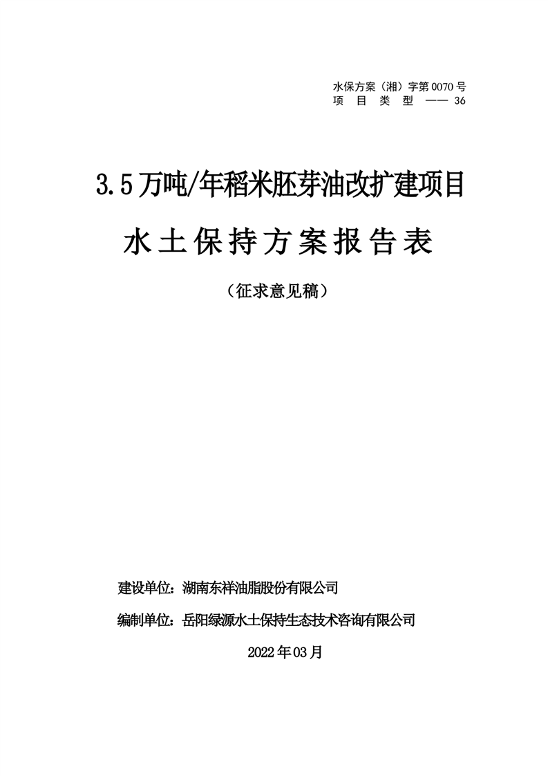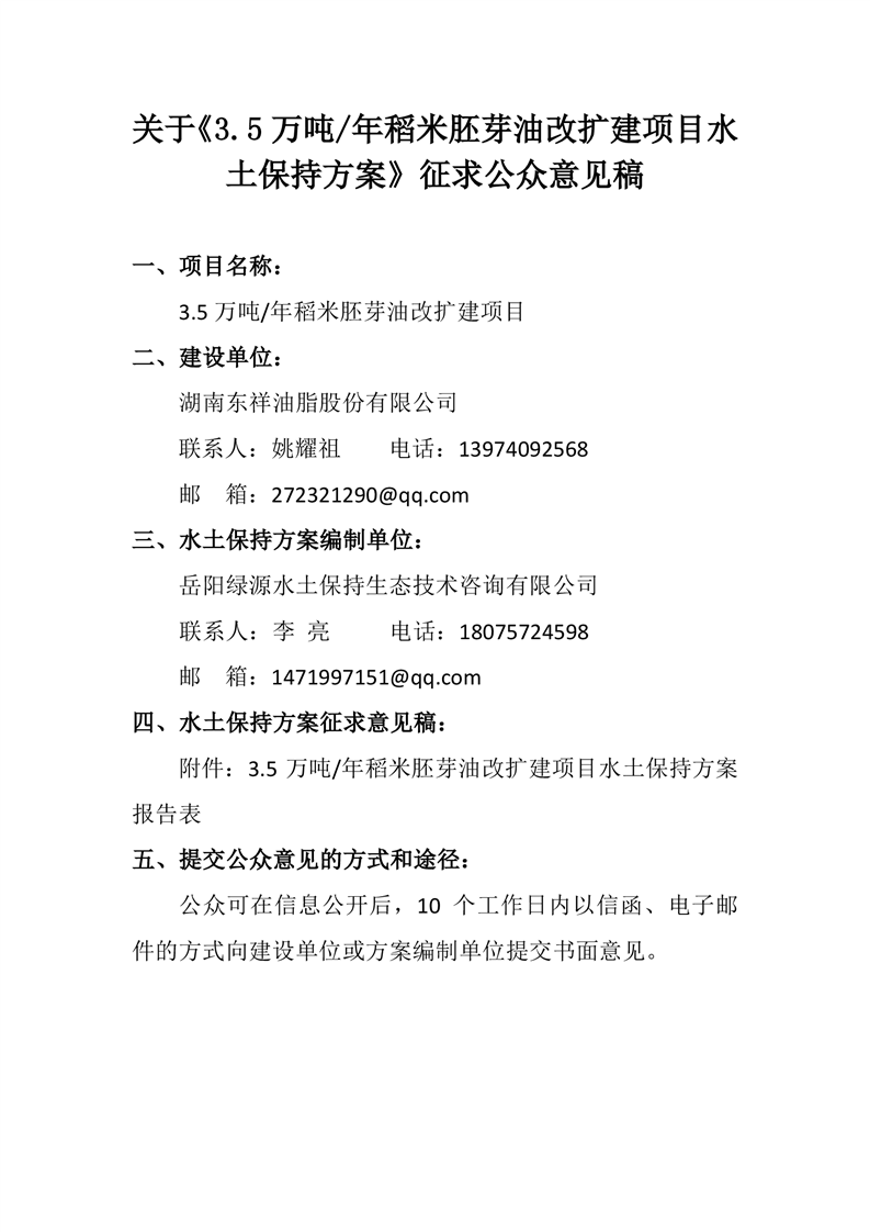 关于《3.5 万吨/年稻米胚芽油改扩建项目水土保持方案》征求公众意见稿
