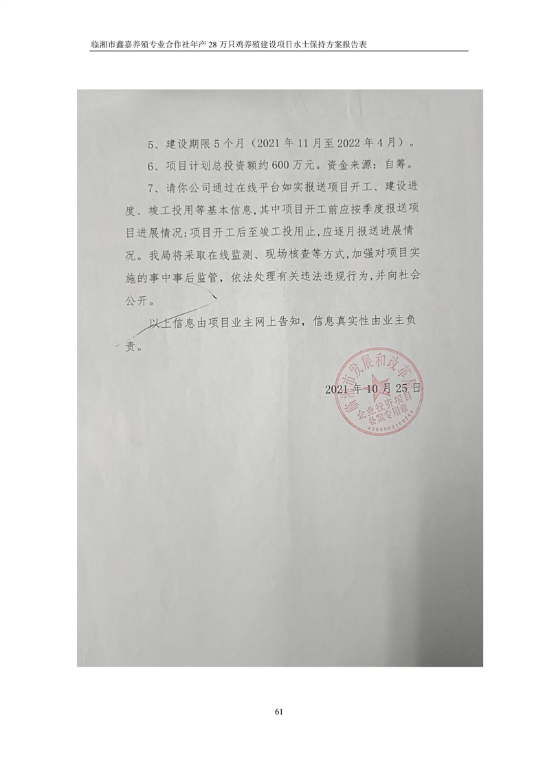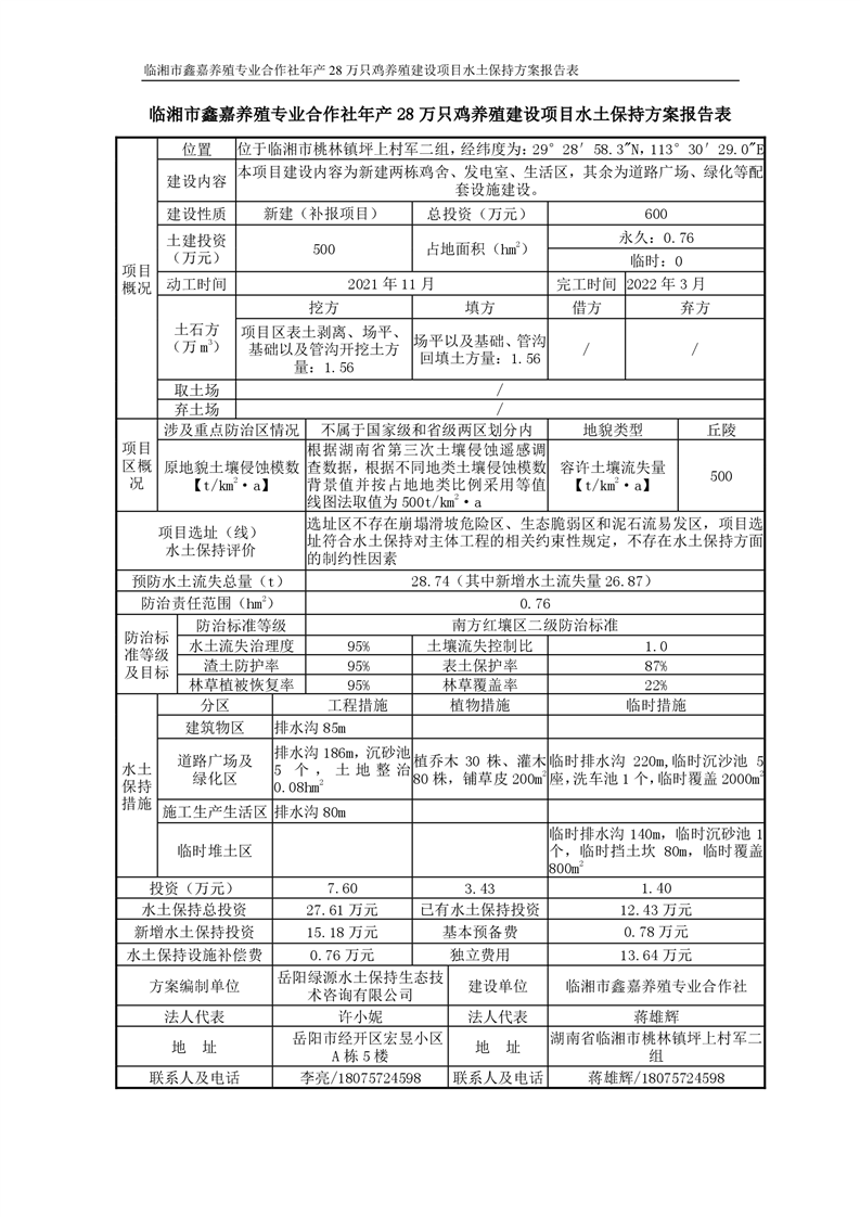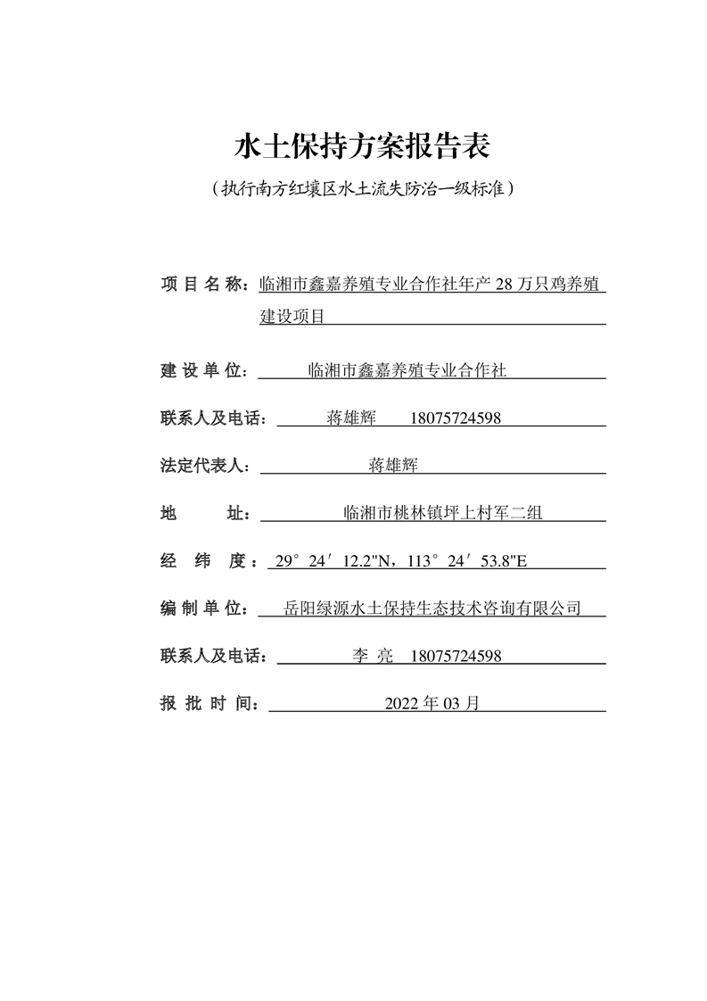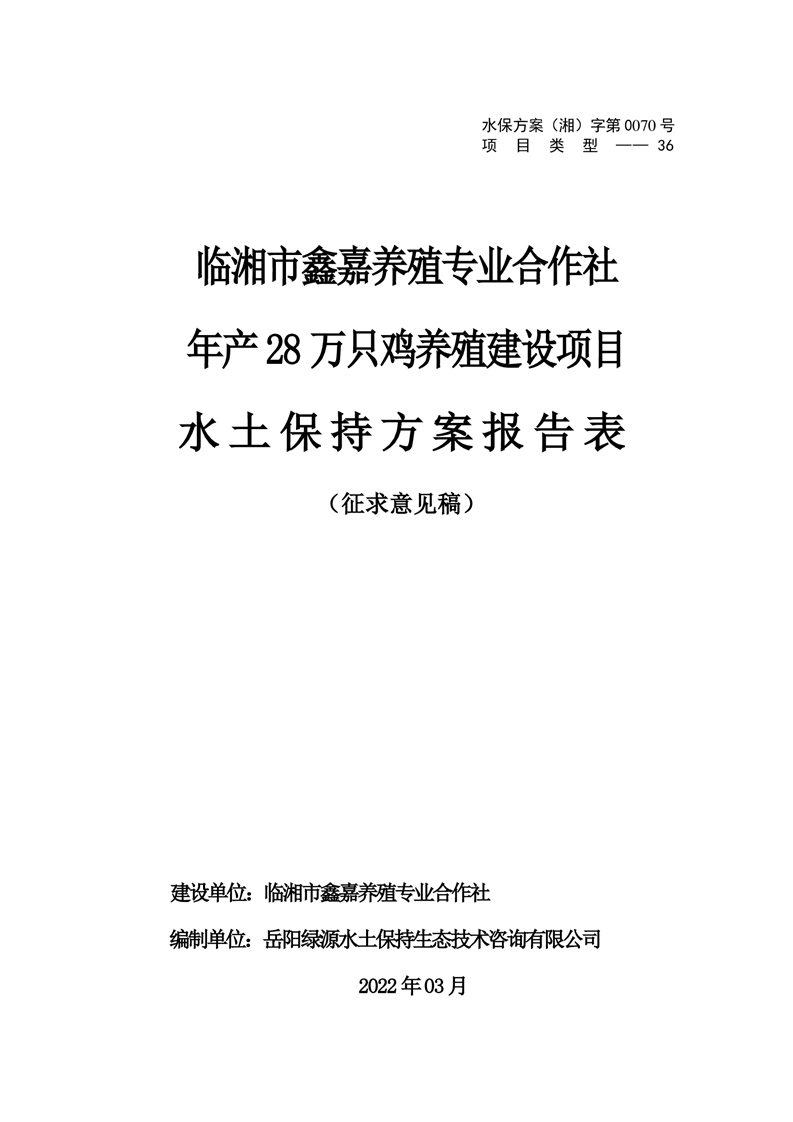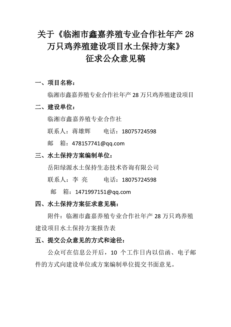关于《临湘市鑫嘉养殖专业合作社年产 28万只鸡养殖建设项目水土保持方案》征求公众意见稿