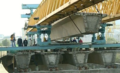 在施工现场,记者看到:施工人员正操作架桥机将一片长30米,重100吨的箱梁稳稳安放在桥墩上。白云大桥首片跨线箱梁的成功架设,标志着施工难度最大的控制性工序取得了决定性突破,为加快工程施工进度、确保道路年底通车打下坚实的基础。