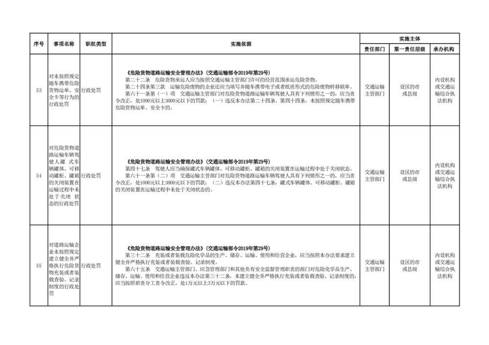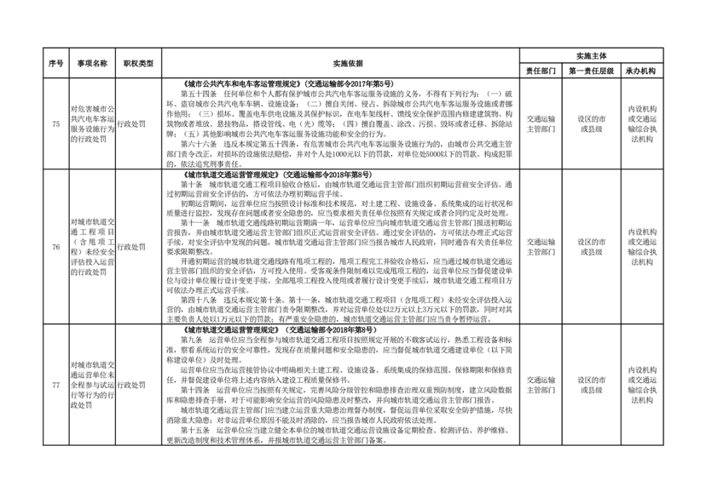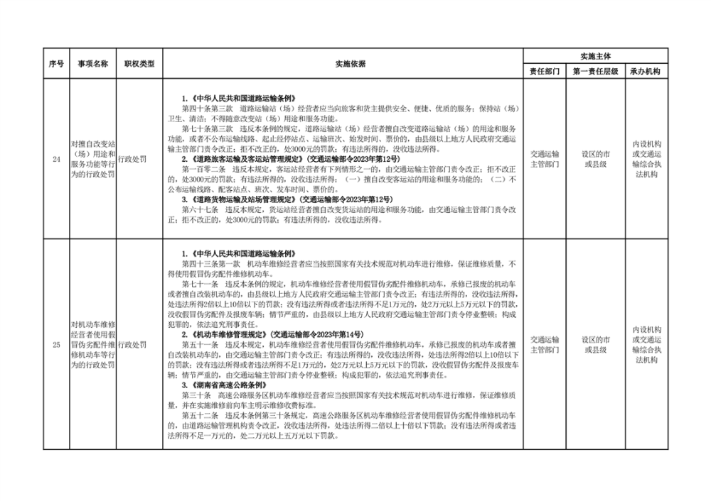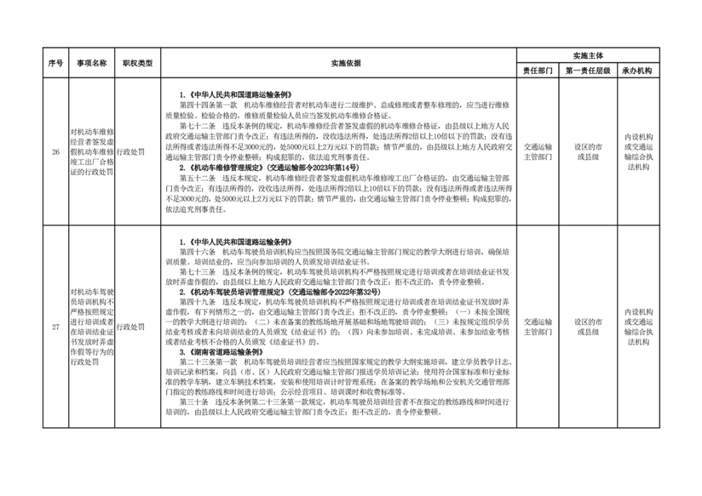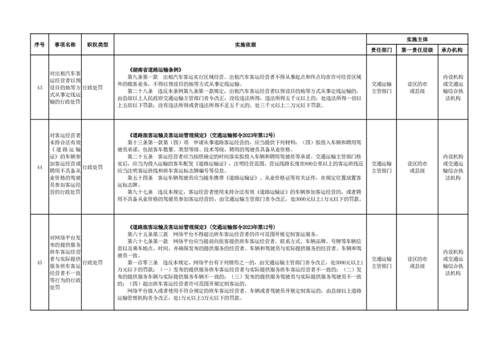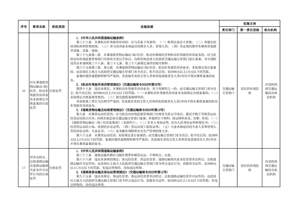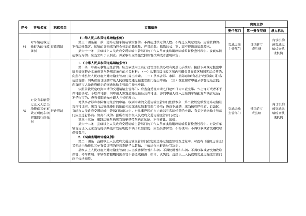 临湘市交通运输综合行政执法事项指导目录 道路运输管理85项