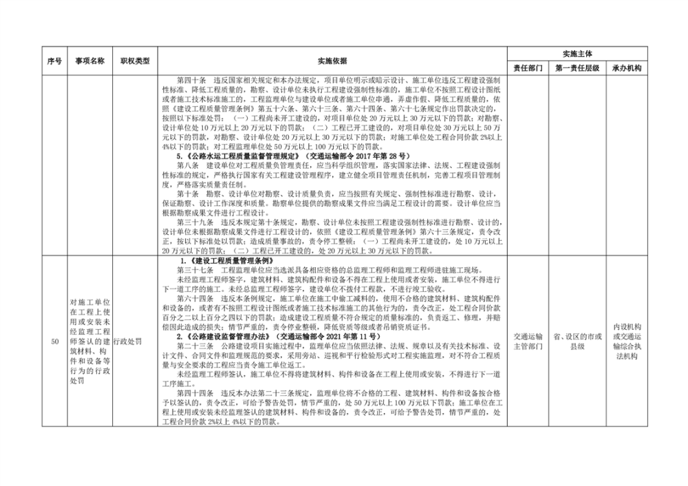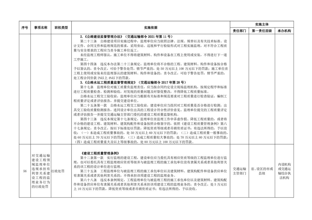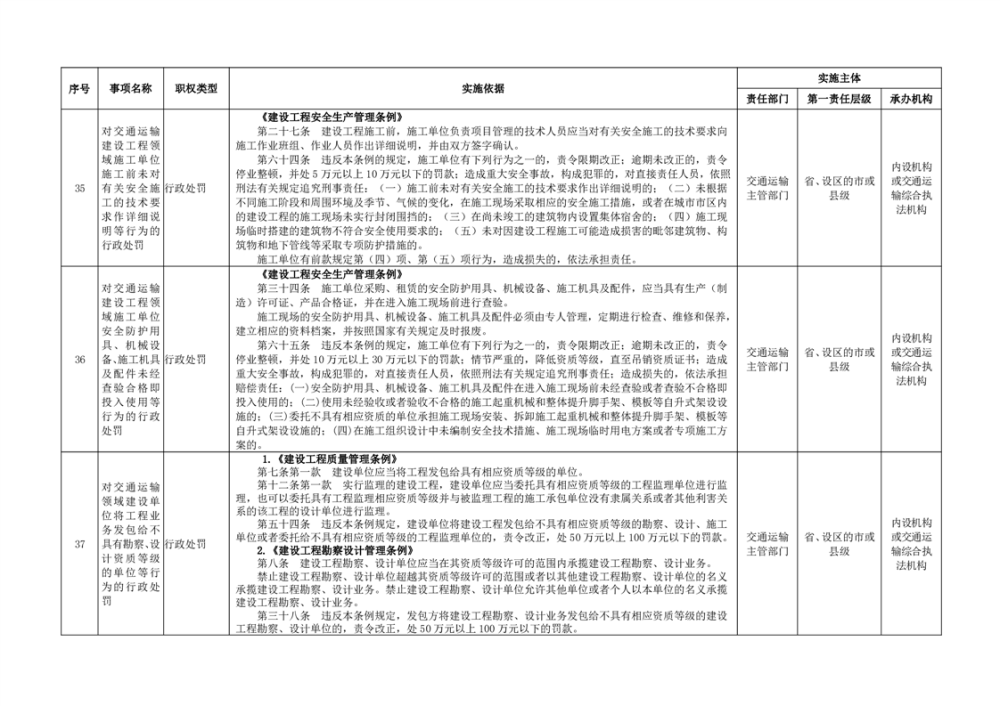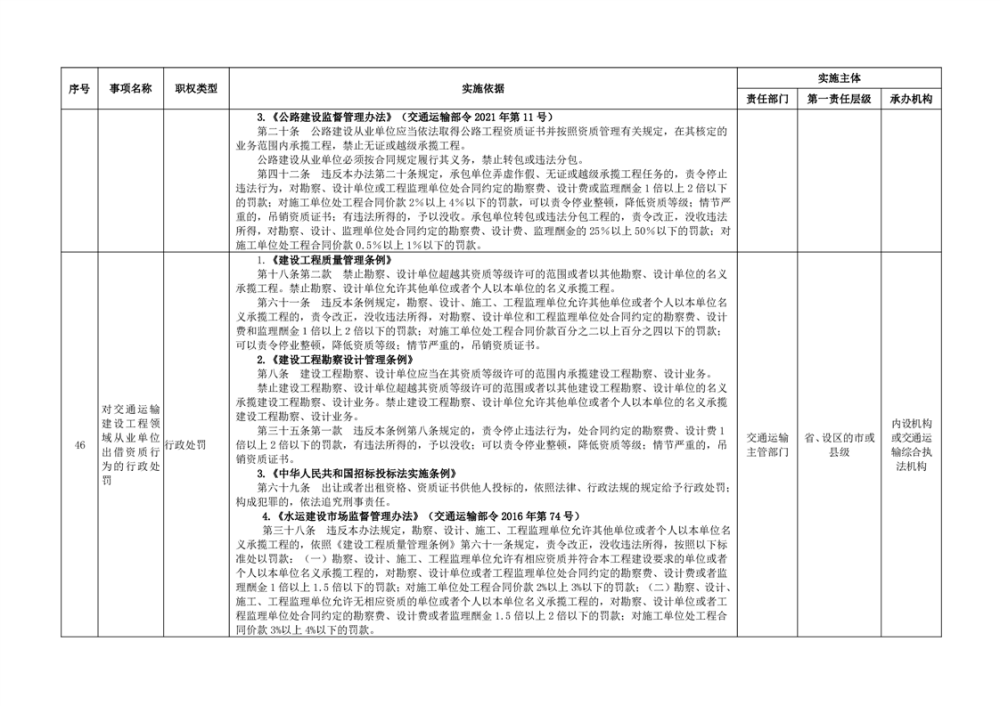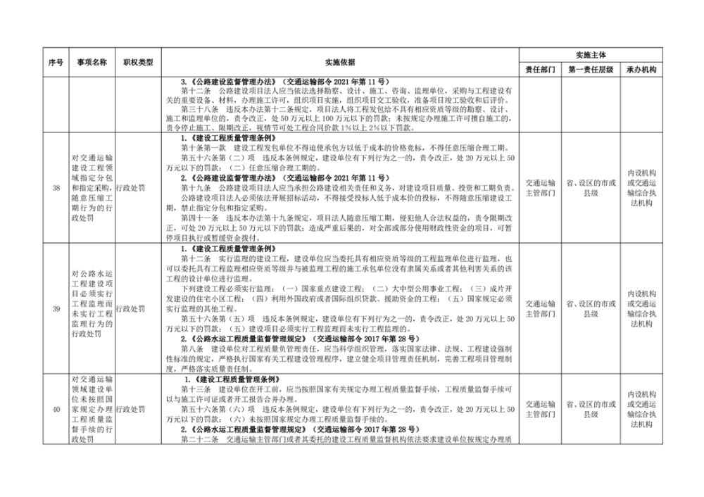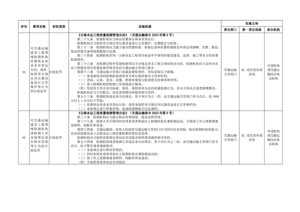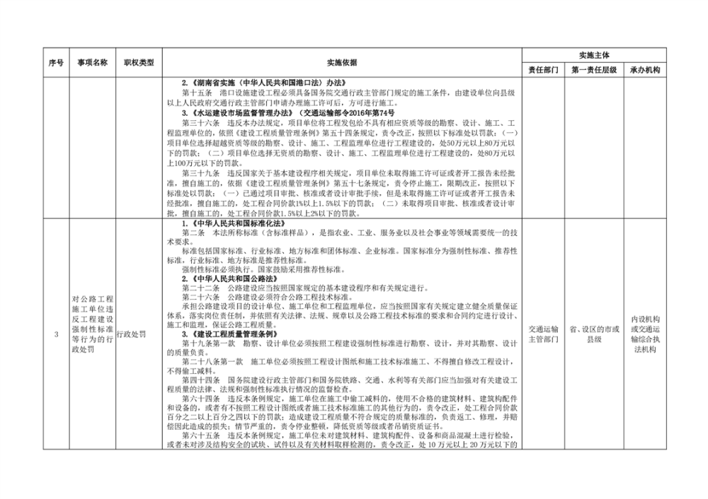 临湘市交通运输综合行政执法事项指导目录 交通建设工程质量安全监督102项