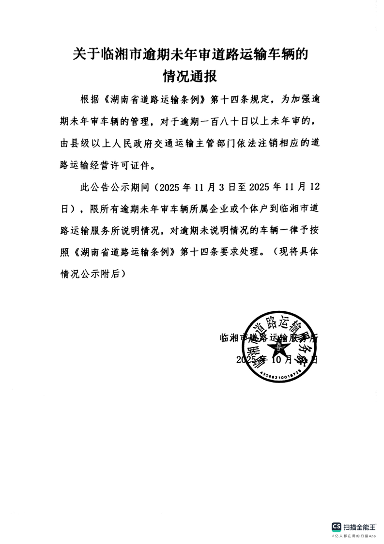关于临湘市逾期未年审道路运输车辆的情况通报(10)