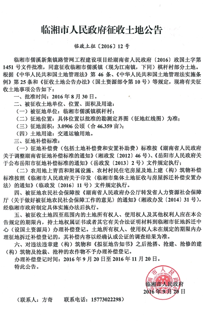 儒溪镇路管网工程建设项目征收土地公告