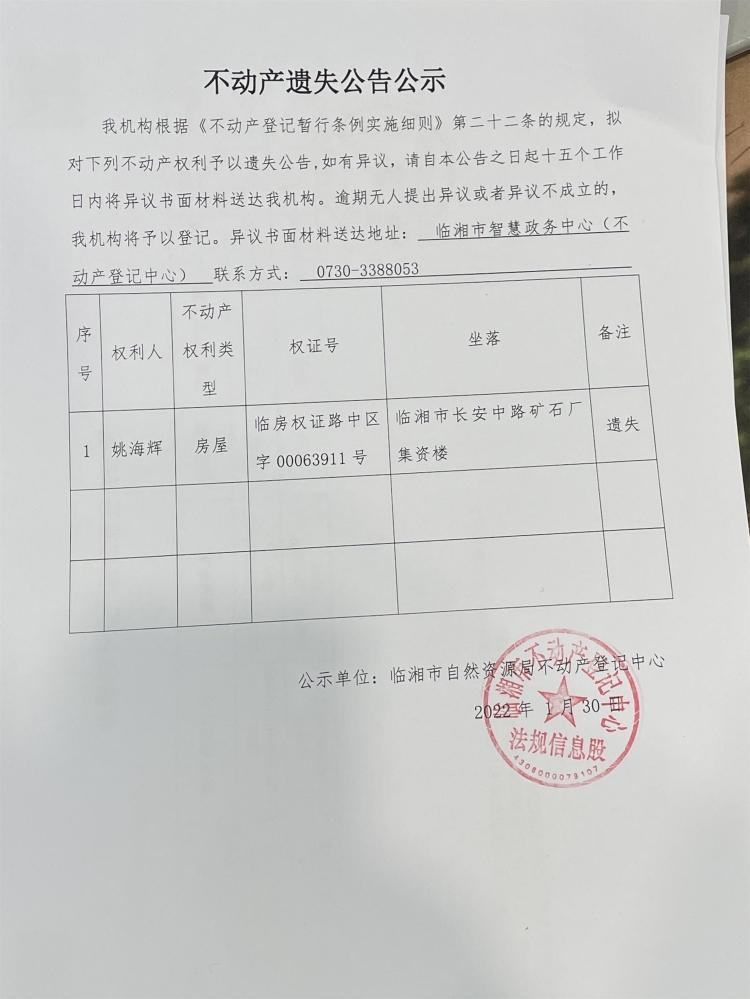 姚海辉不动产遗失公告公示