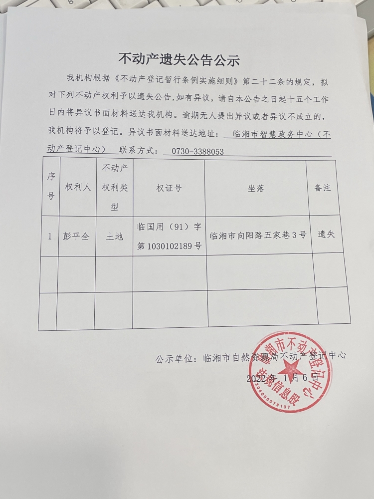 彭平全不动产遗失公告公示
