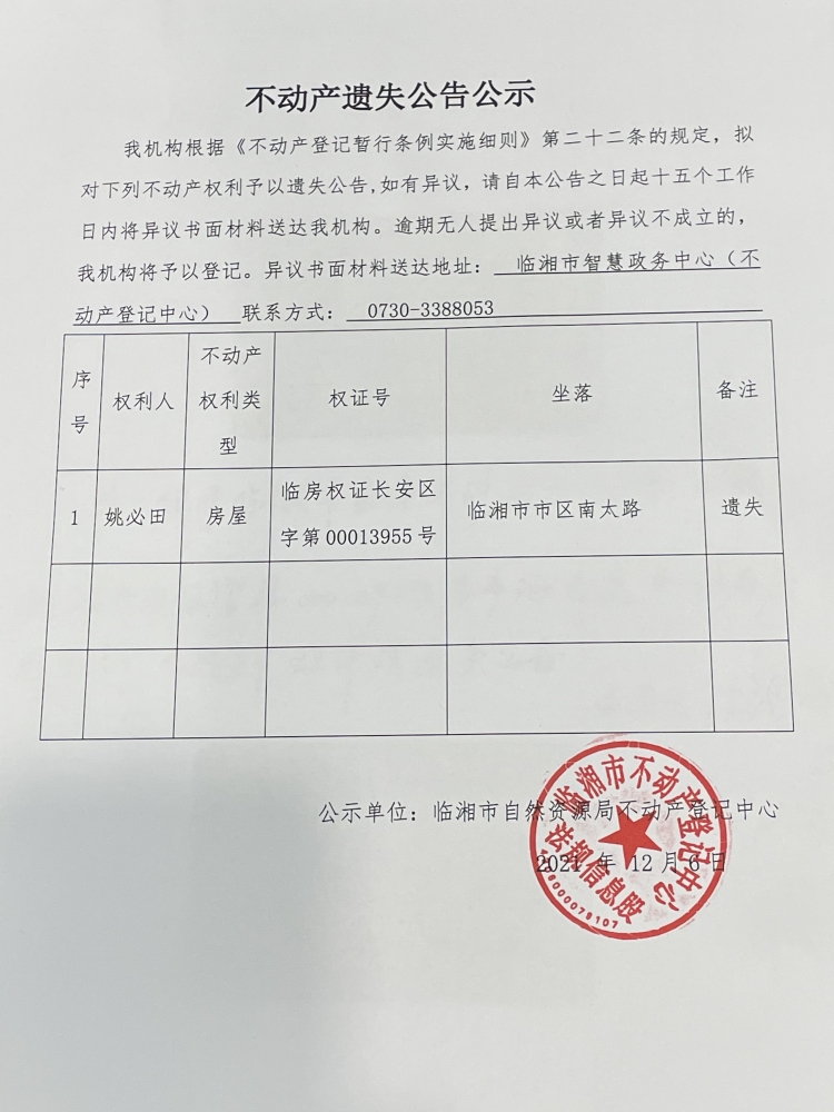 姚必田不动产遗失公告公示