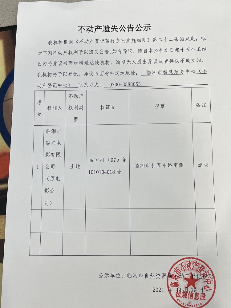 临湘市瑞兴电影有限公司(原电影公司)不动产遗失公告公示