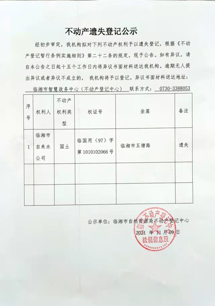 临湘市自来水公司不动产遗失登记公示