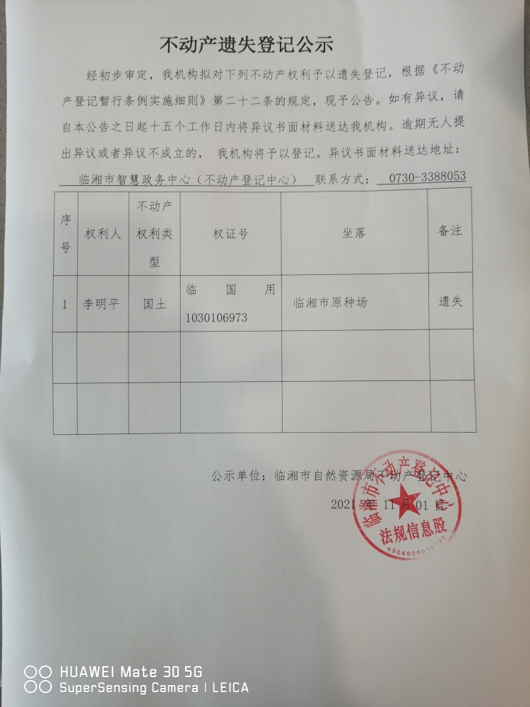 李明平不动产遗失登记公示