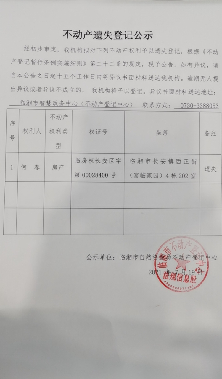 何春不动产遗失登记公示