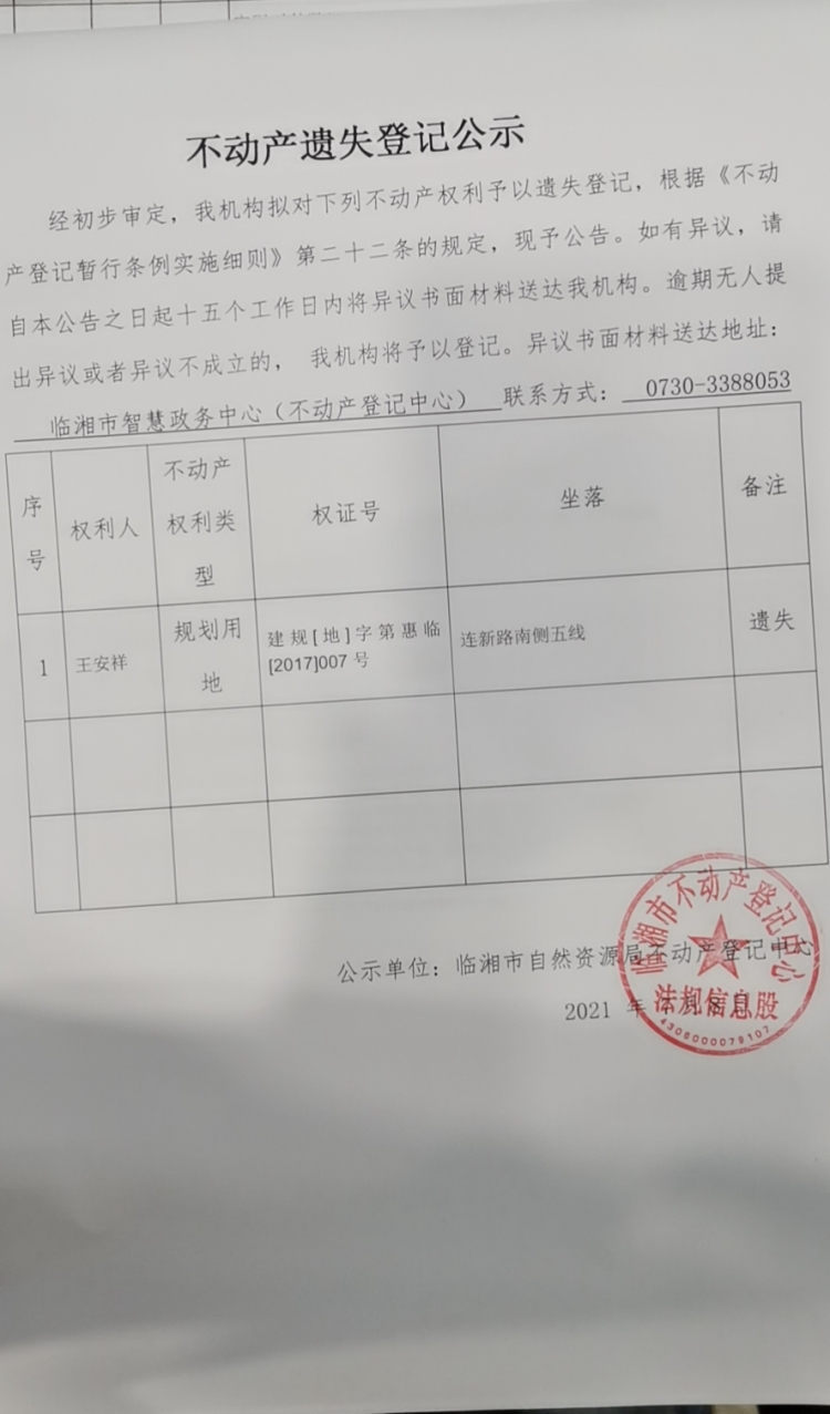 王安祥不动产遗失登记公示
