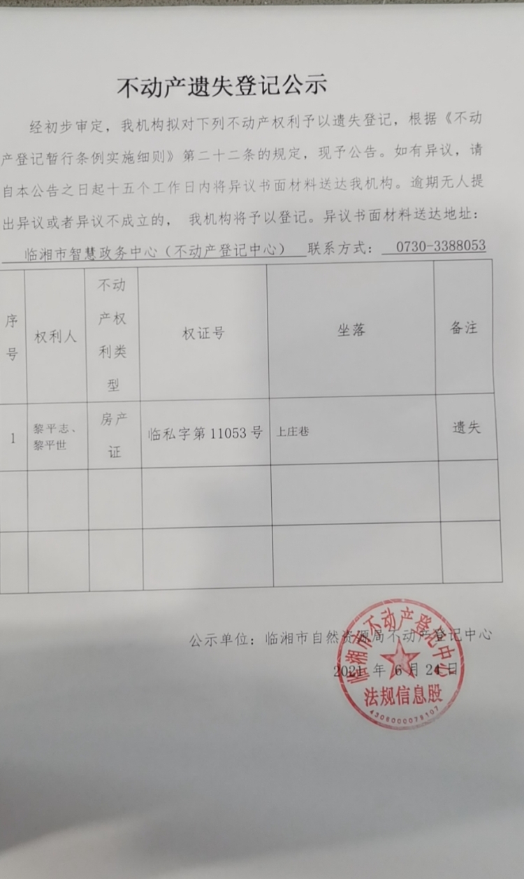 黎平志、黎平世不动产遗失登记公示