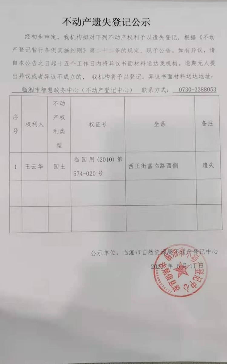 王云华不动产遗失登记公示