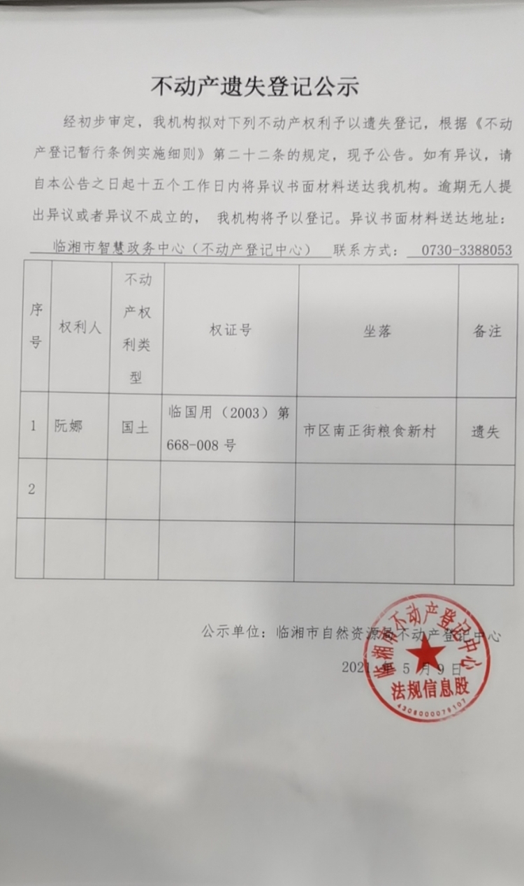 阮娜临国用(2003)668-008号不动产遗失登记公示