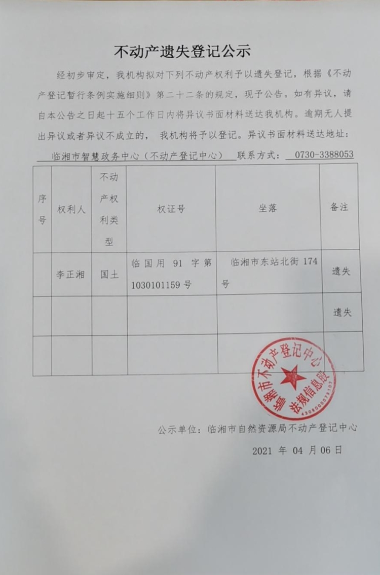李正湘不动产遗失登记公示