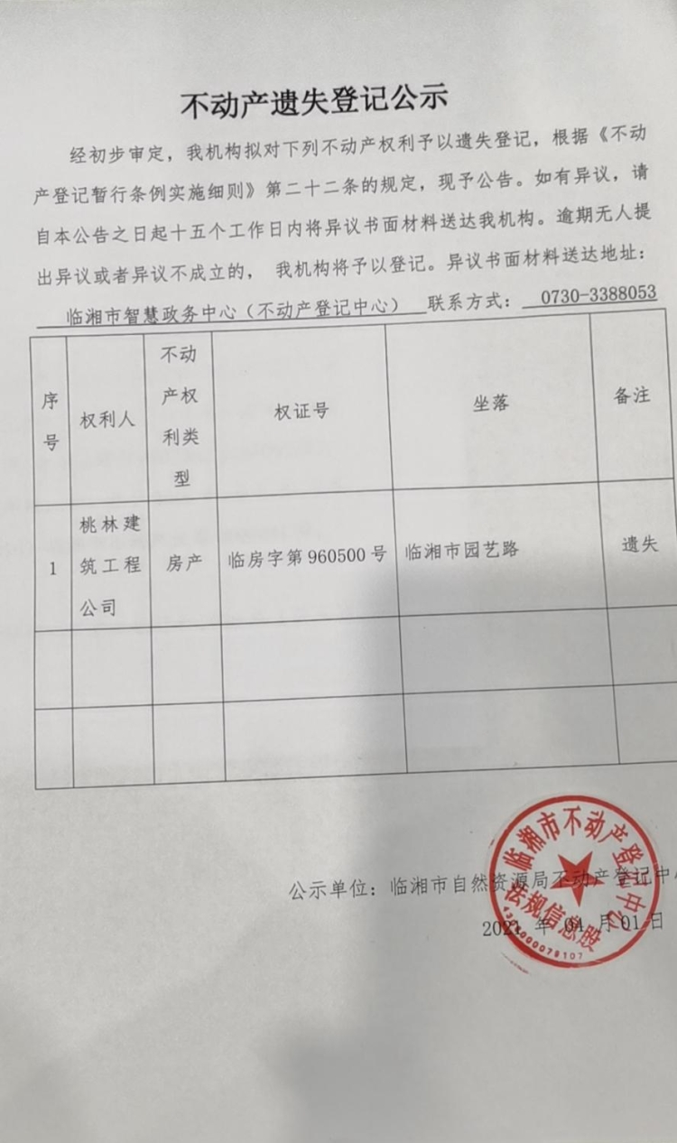 桃林建筑工程公司不动产遗失登记公示
