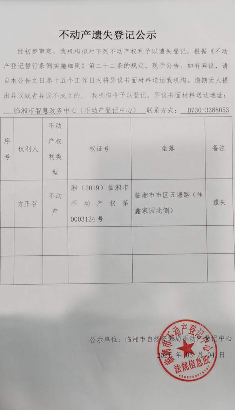 方正召不动产遗失登记公示