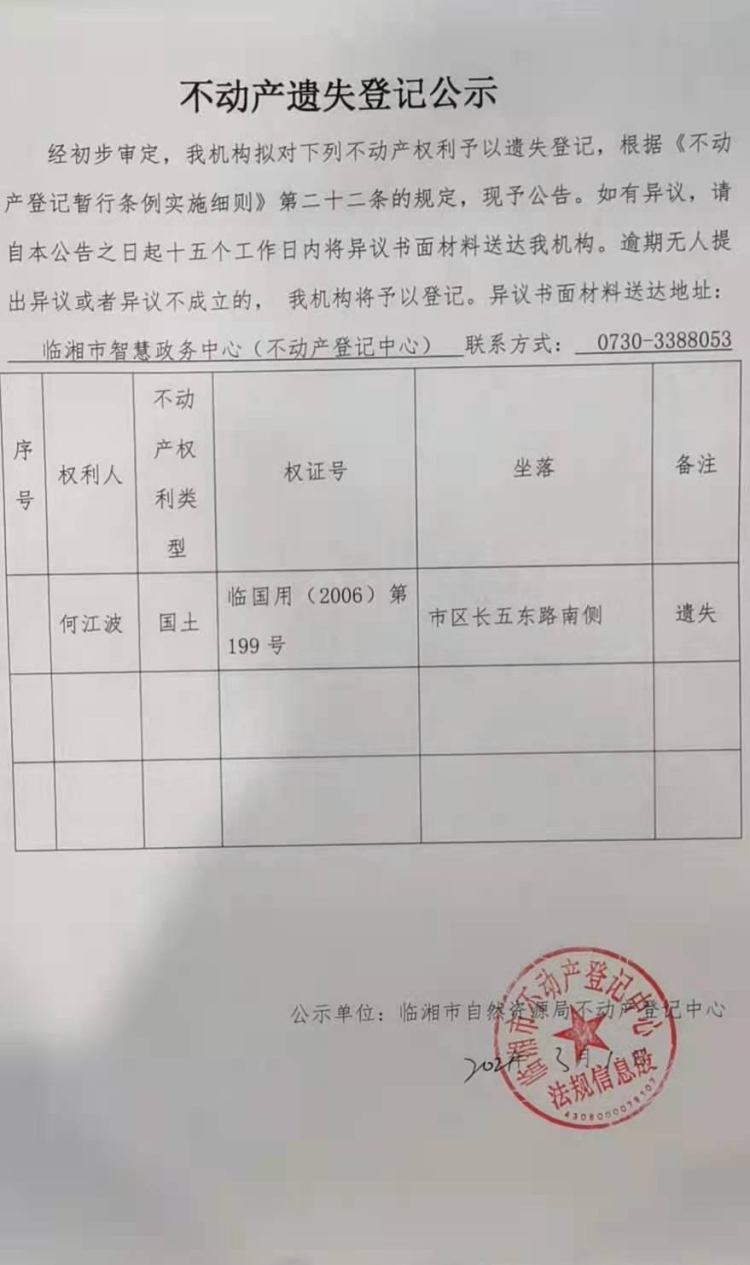 何江波不动产遗失登记