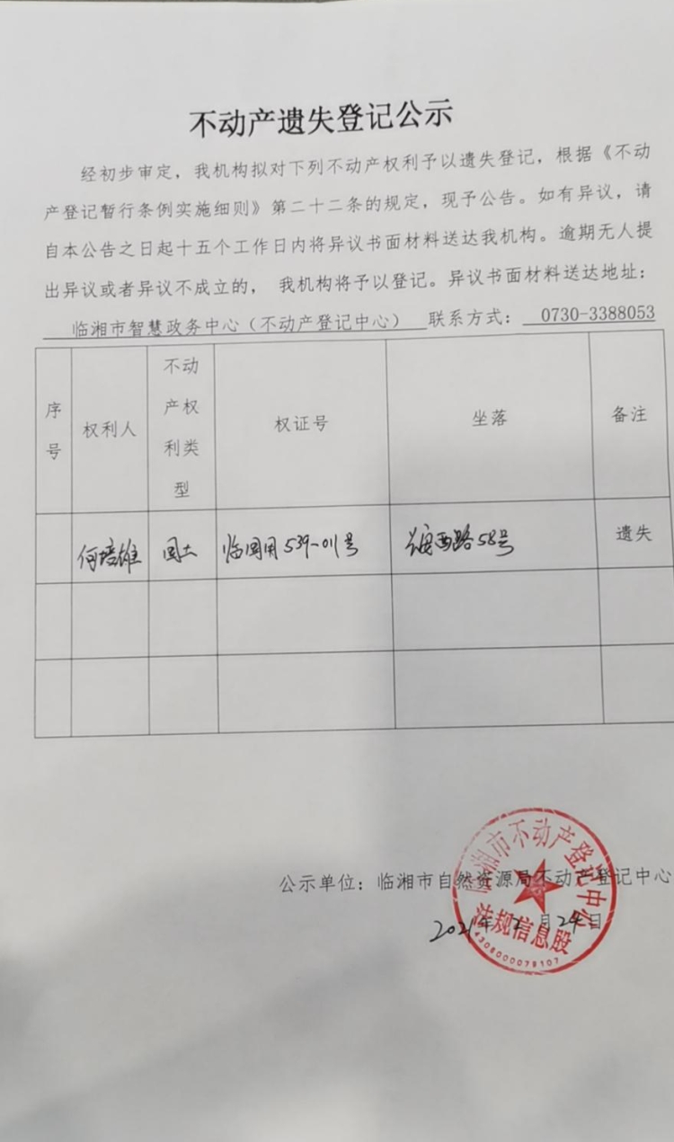 何培雄不动产遗失登记公示