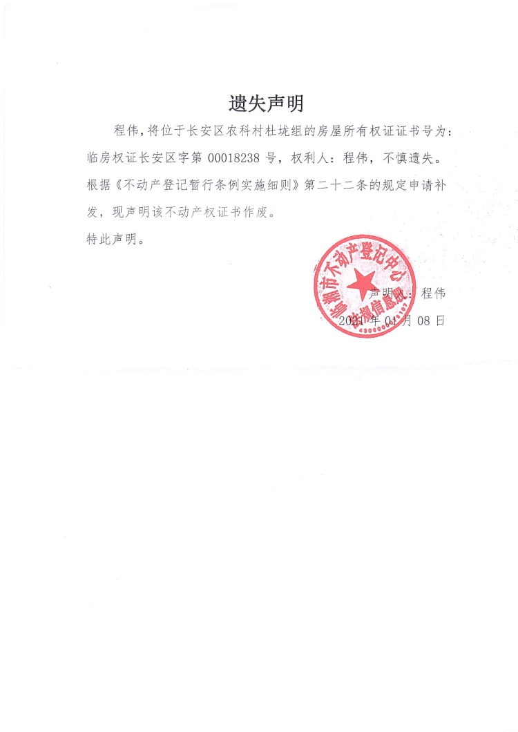 程伟房屋所有权证遗失声明