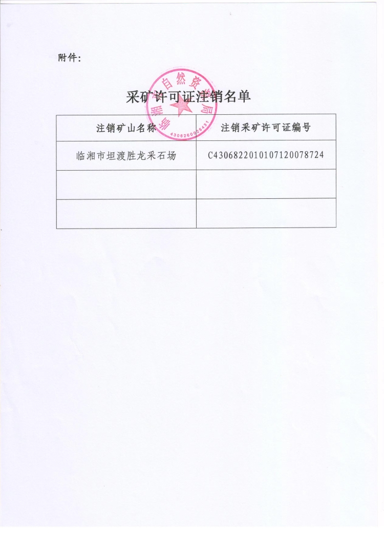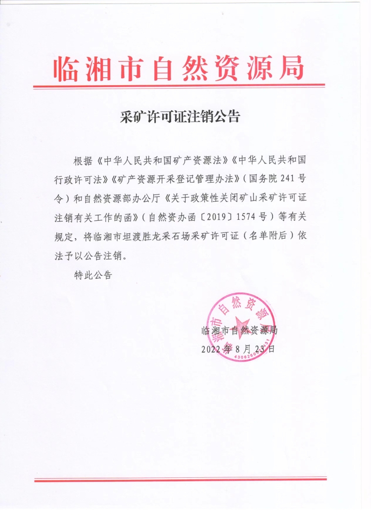 临湘市坦渡胜龙采石场采矿许可证注销公告