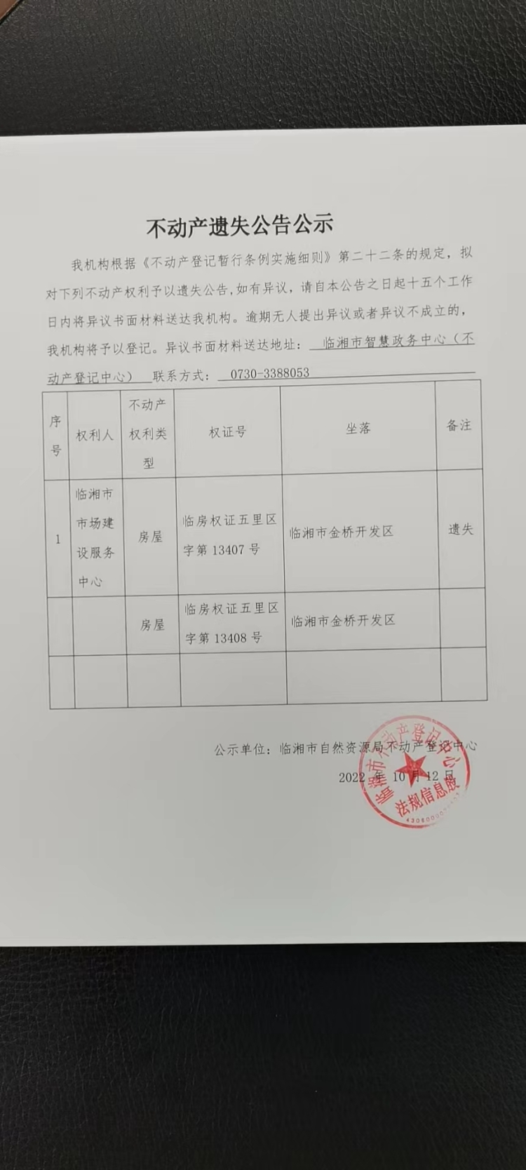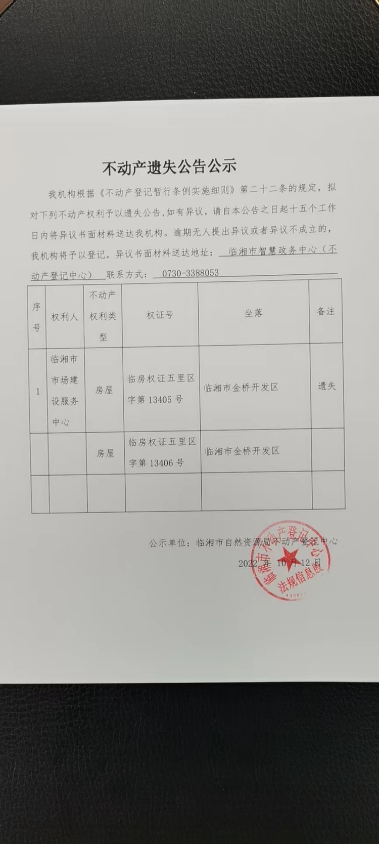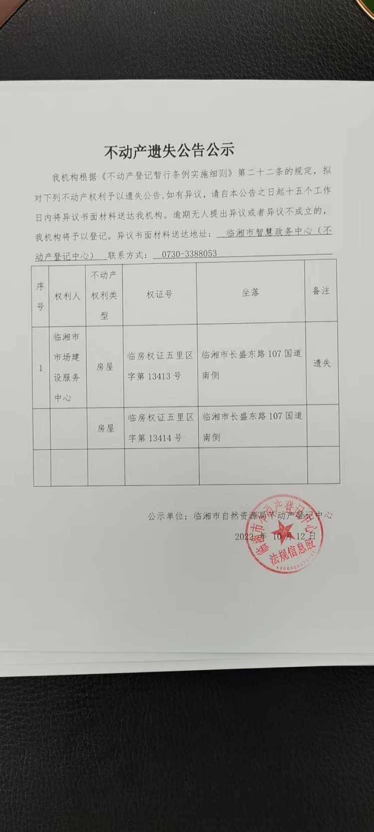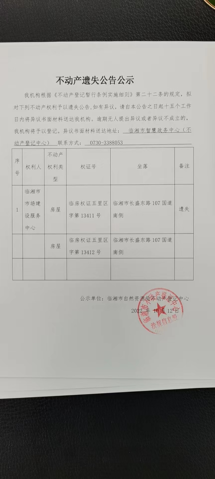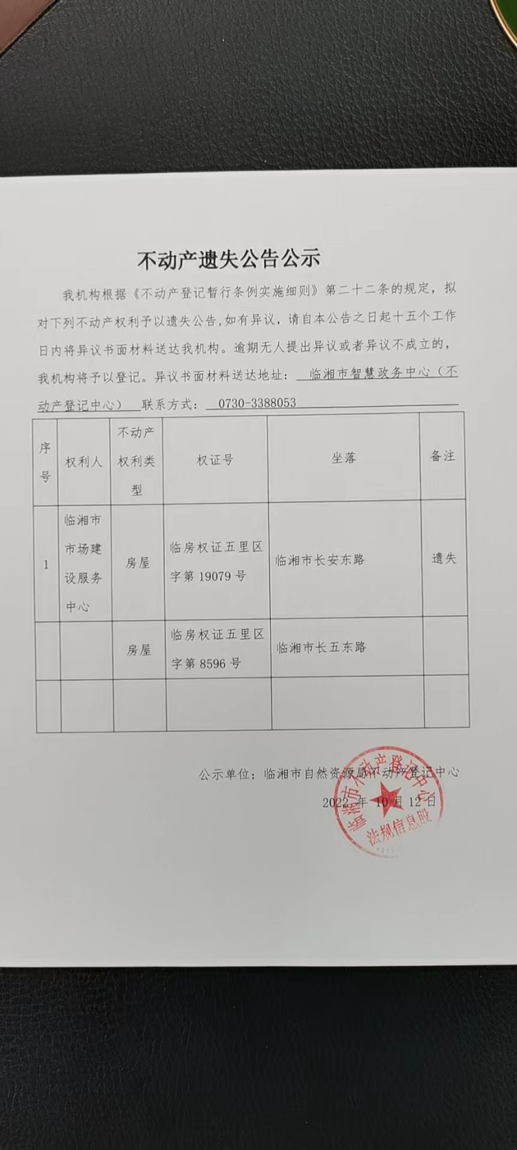 临湘市市场建设服务中心不动产遗失公告公示
