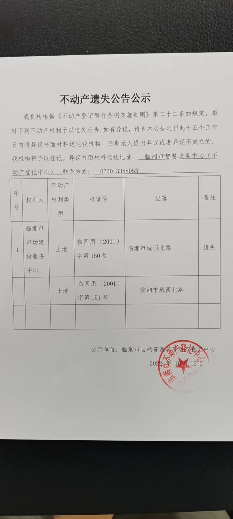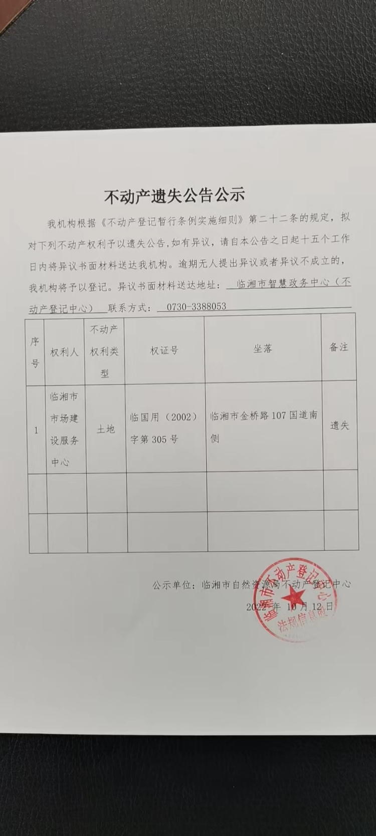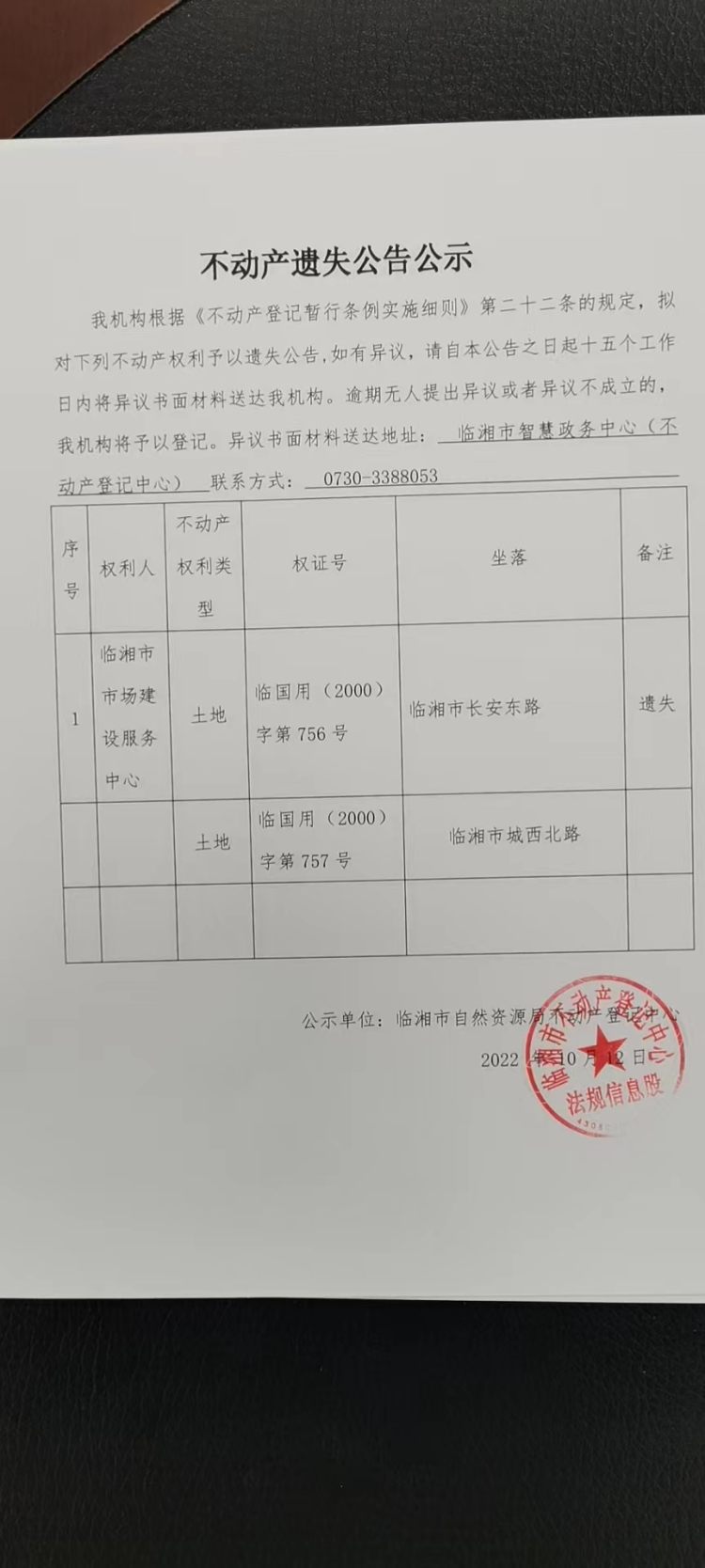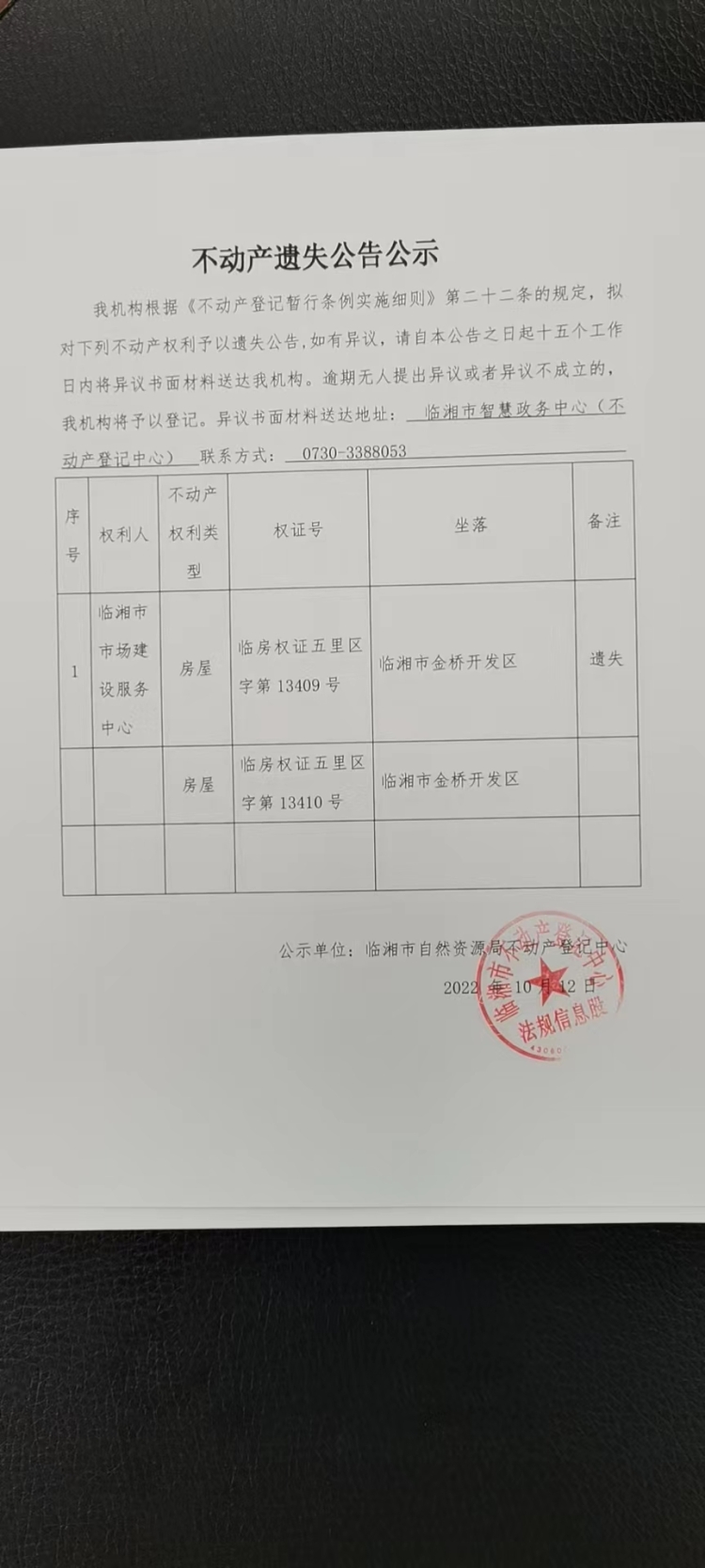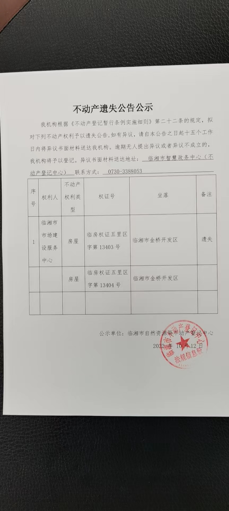 临湘市市场建设服务中心不动产遗失公告公示