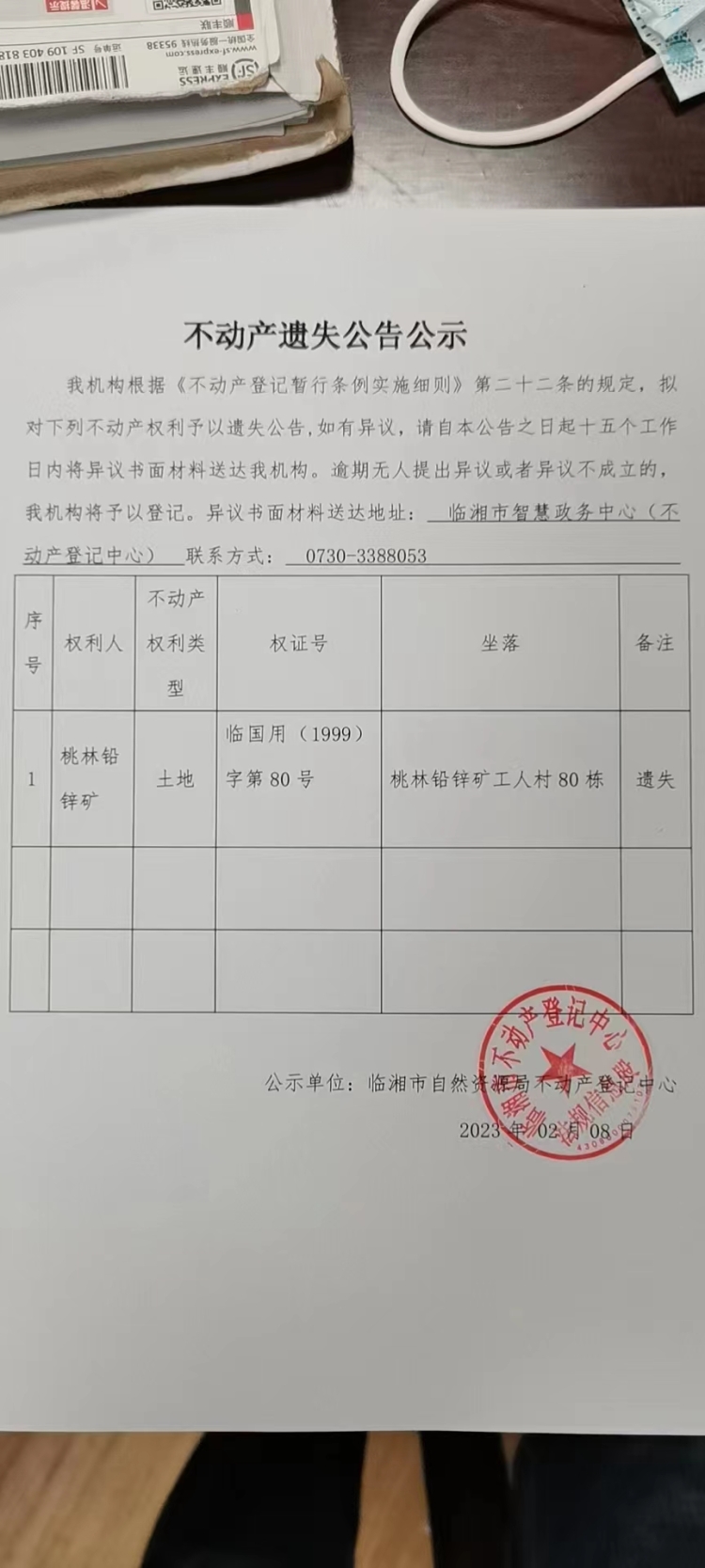 桃林铅锌矿不动产遗失公告公示