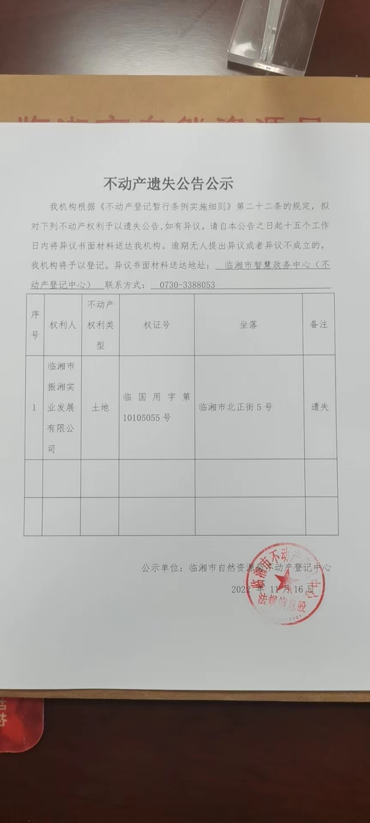 临湘市振湘实业发展有限公司不动产遗失公告公示