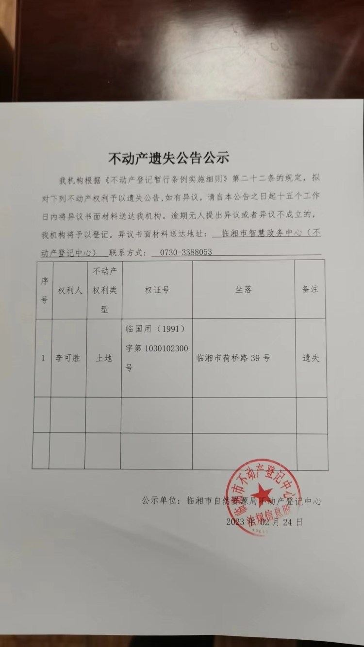 李可胜不动产遗失公告公示