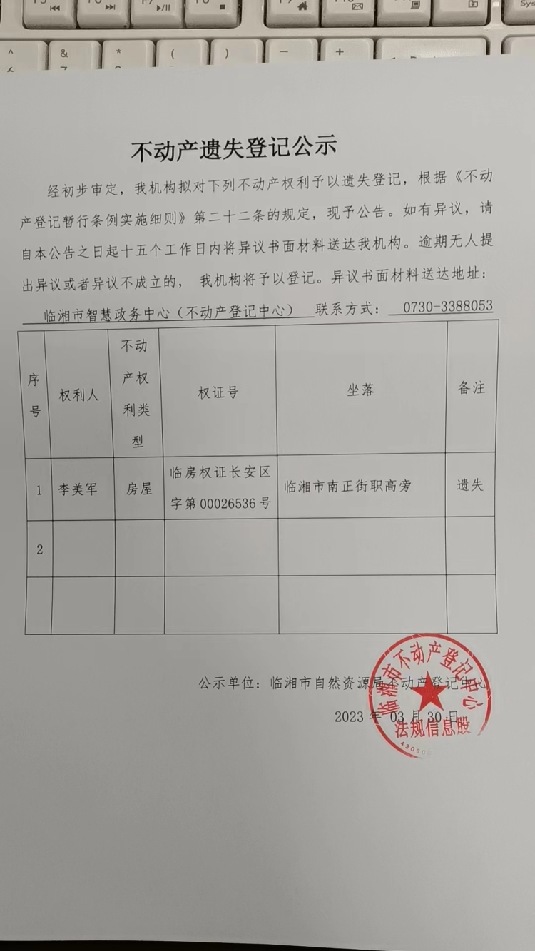 李美军不动产遗失公告公示