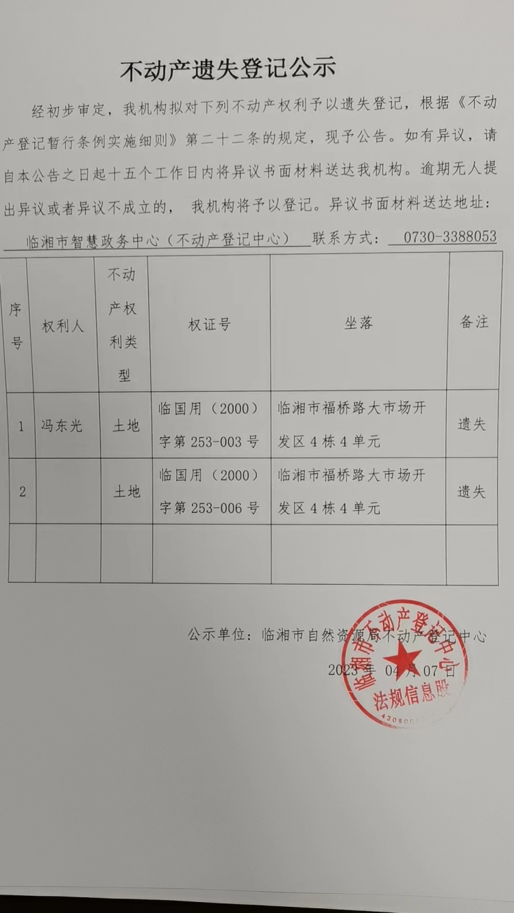 冯东光不动产遗失公告公示