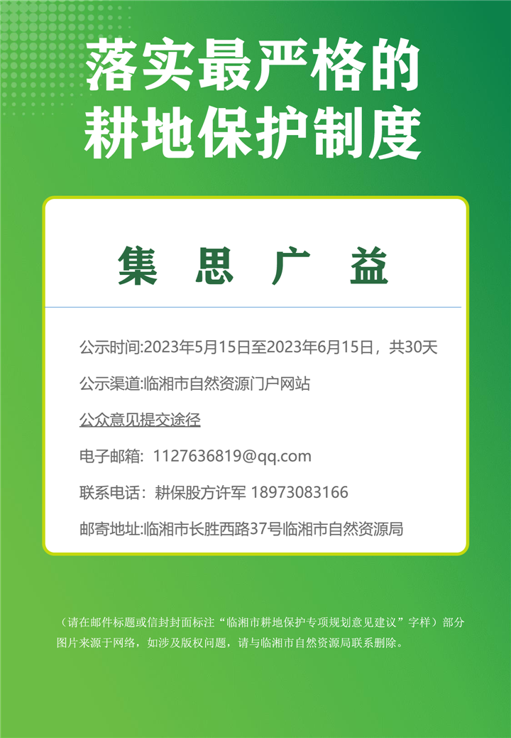 为深入贯彻落实习近平总书记关于耕地保护系列重要讲话净胜和党中央、国务院和省委省政府有关耕地保护的大政方针和决策部署,统筹发展和安全,严守耕地红线和粮食安全底线,临湘市启动编制《临湘市耕地保护国土空间专项规划(2021-2035年)》(以下简称《规划》),目前,《规划》已形成草案,为进一步提高《规划》科学性、可实践性,现将规划进行公示,广泛征求社会各界和群众意见建议。