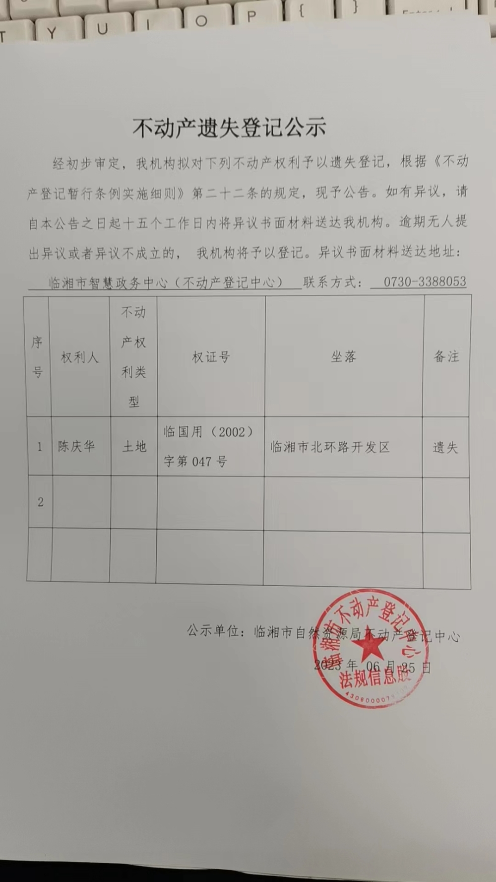 陈庆华不动产遗失登记公示