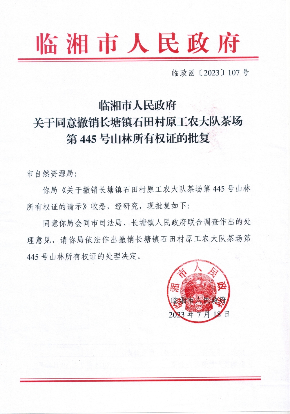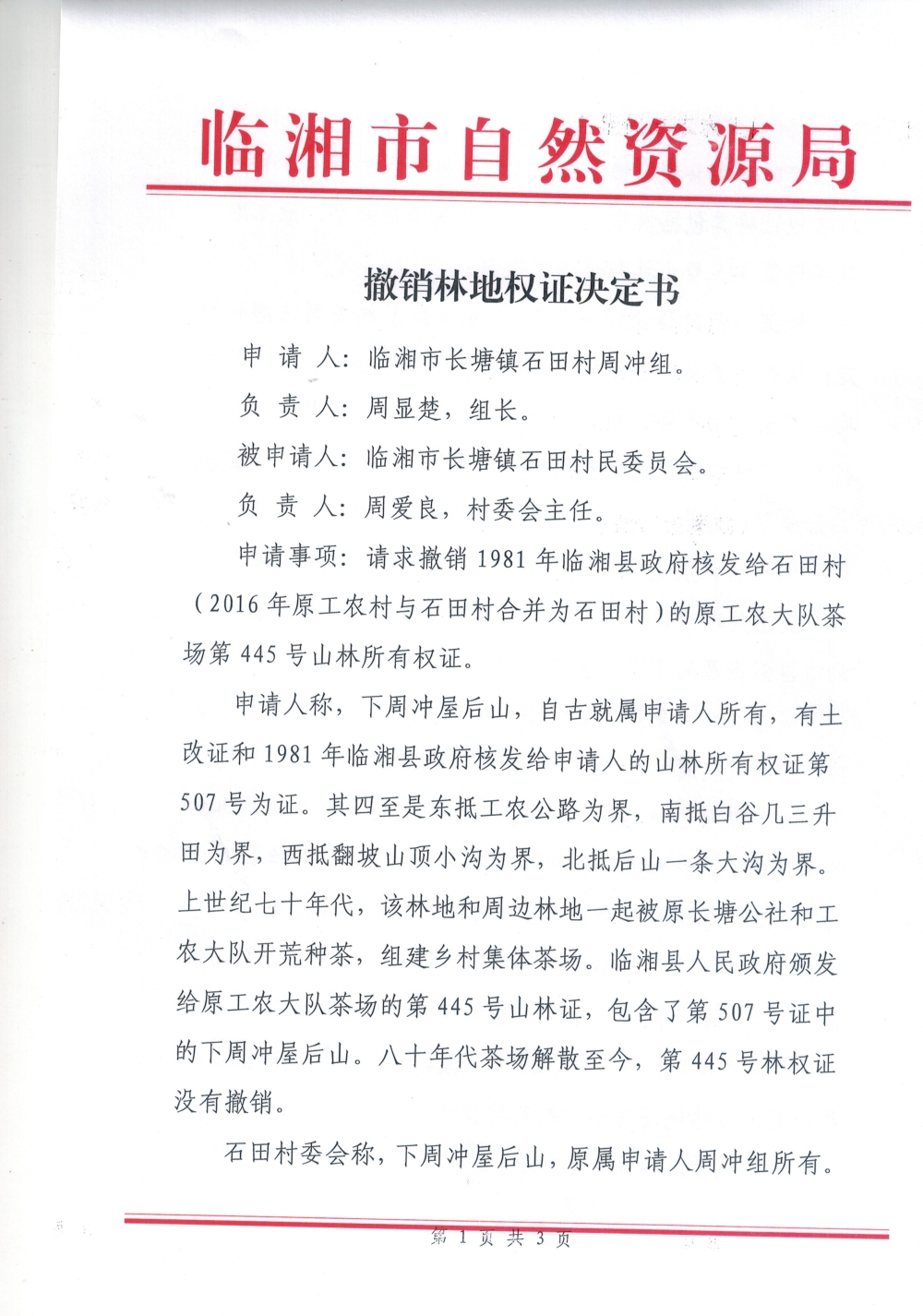 撤销长塘镇石田村周冲组林地权证决定书公告